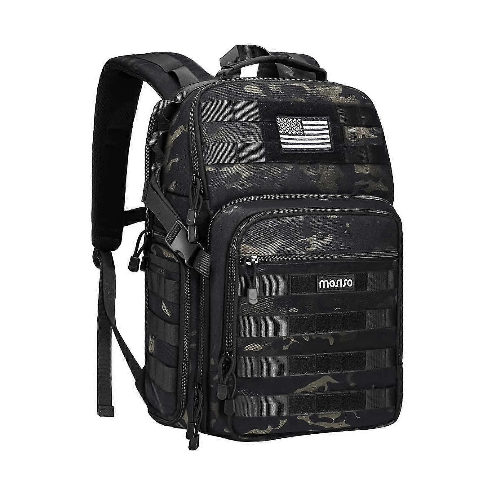 .This night camouflage tactical camera backpack daily daypack is made of durable polyester material. The detachable US flag patch on the front and the webbing extending throughout the whole bag can attach additional pouches or outdoor equipment. The inner foam padded layer can provide good buffer and protection for your inner items from scratches, impact, shock and drops. With reinforcement edge and side-loading compression system, the base is perfectly used in the wild.