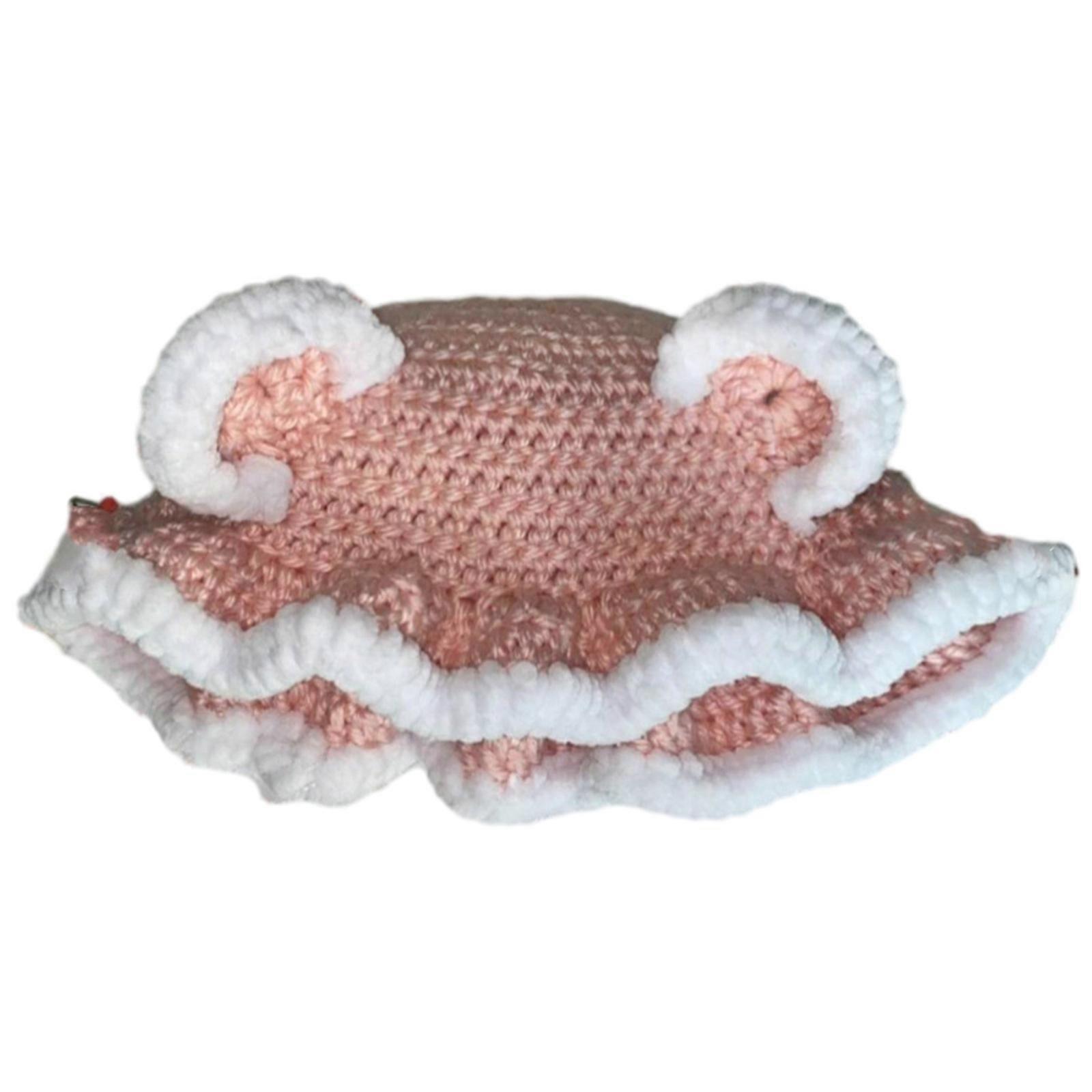 Winter Crochet 3D Bear Ear Bucket Hat Ladies Camping Fisherman Hat Ruffled Brim Hat for Girlfriend Christmas Gift Pink