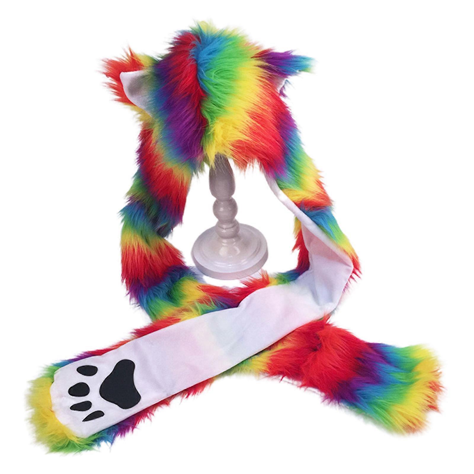Winter Faux Fur Plush Hood Hat Scarf and Gloves Mittens 3 in 1 Rainbow for Cat Ears Long Hooded Shawl Wrap for Women Gir B