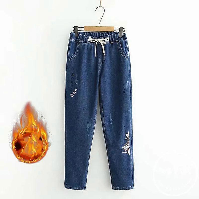 Winter Velvet Lined Jeans Harem Pants Women Plush High Waist Baggy Vaqueros Trousers Warm Print Thick Lace Up Ankle-length Denim