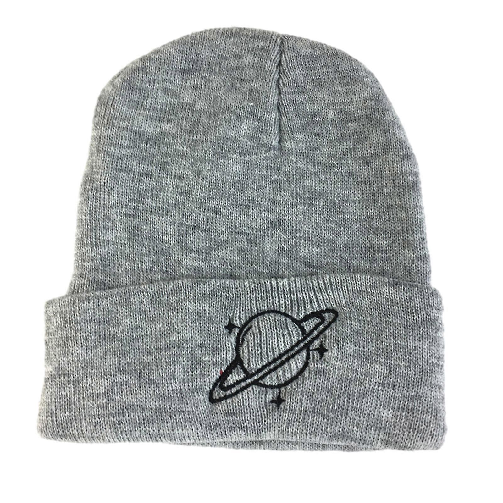 Embroidery Planet Pattern Beanie Adult Elastic Hat Winter Warmer Knitted Hat Cold Winter Presents for Students Teenagers Gray