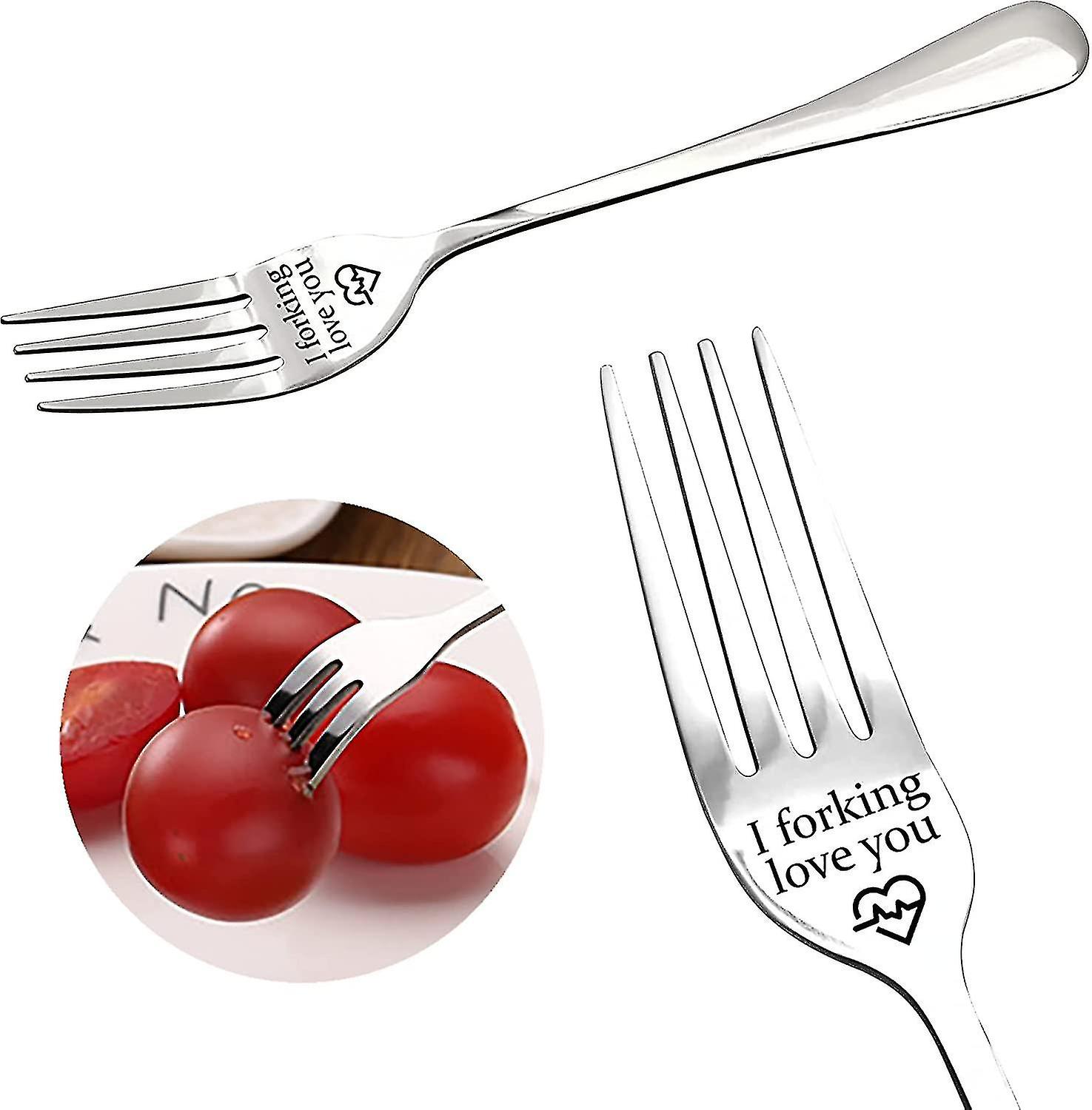 I Forking Love You Fork: The romantic word "I forking love you" is engraved on this elegant fork, which is beautifully packaged, the couple fork is a great gift to express your love, I love you fork is a fun gift for your lover, partner, family and friends. Premium Material: The engraved fork is made of food grade stainless steel, with smooth finish surface and mirror polish, durable and not easy to rust. Unique carved fork will enhance your dining experience. What You Get: Package includes 1pcs stainless steel engraved fork, length 21cm/ 8.27in, width: 3cm/ 1.18in, weight: 39grams. Humanized design measure and weight are just right for you. A Gift Of Love: This fork is a gift full of love. Perfect for home, hotel, restaurant, entertainment, holiday dining and more. This meaningful I forking love you message is a great way to show your love to someone you care about. 1.The stainless steel engraving fork is made of high quality stainless steel,rust-proof, strong and durable 2.The surface of the dinner fork adopts a mirror polishing process,the shell is shiny,the humanized length and weight design are just right,balanced and comfortable to hold 3. Highly personalized carving fork, engraved with "I forking love you",classic fashion can be mixed with most tableware to enhance your dining experience 4. Ideal for weddings,parties or everyday use,the best gift for Christmas,thanksgiving, birthday, valentine's day, mother's day Notes The fork is sharp, please use it with care Due to manual measurement, there may be an error of 1~2cm, please forgive me Product material: 304 stainless steel fine polished Product color: Silver Size: 21cm long Package includes: 1pc * fork
