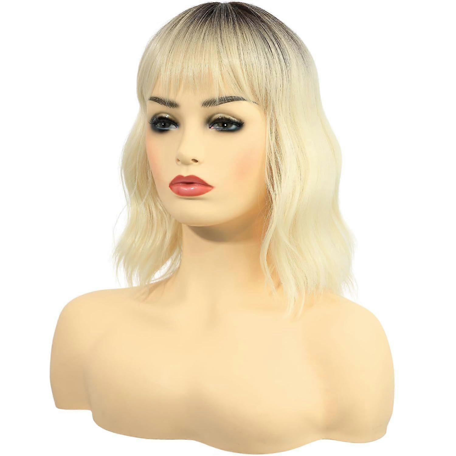Short Wavy Blonde Ombre Wigs with Bangs Natural Heat Resistant Synthetic Hair