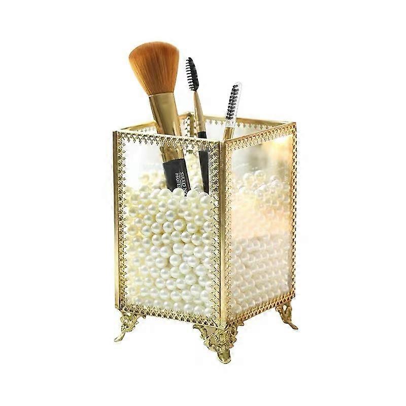 Makeup Brush Holder Glass with White Pearls for Dresser Vanity Countertop