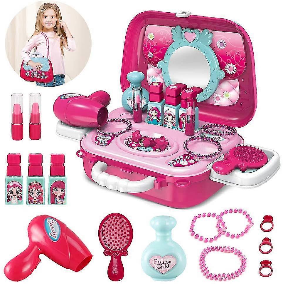 Makeup kit for girls includes 20 items that real salons would use. Pink makeup box*1, Toy hair dryer*1, Mirror*1, Makeup brush*1, Toy lipstick*2, Cosmetic bottle*1, >Toy nail polish bottle*3, plastic ring*3, necklace*1, bracelet*2, tray*3, sticker*1 and strap*1.