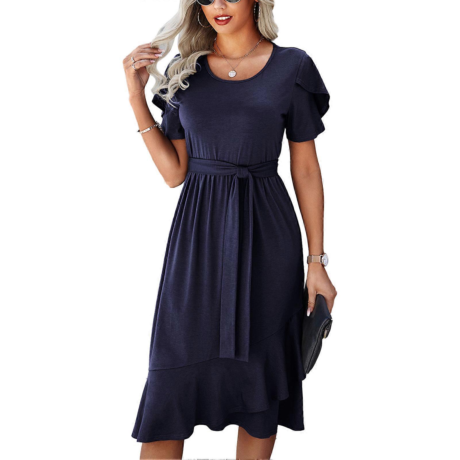 Short Sleeve Dress Elegant Women's Spring Summer Round Neck Solid Color Tie Fal Clothing Purplish Blue XL