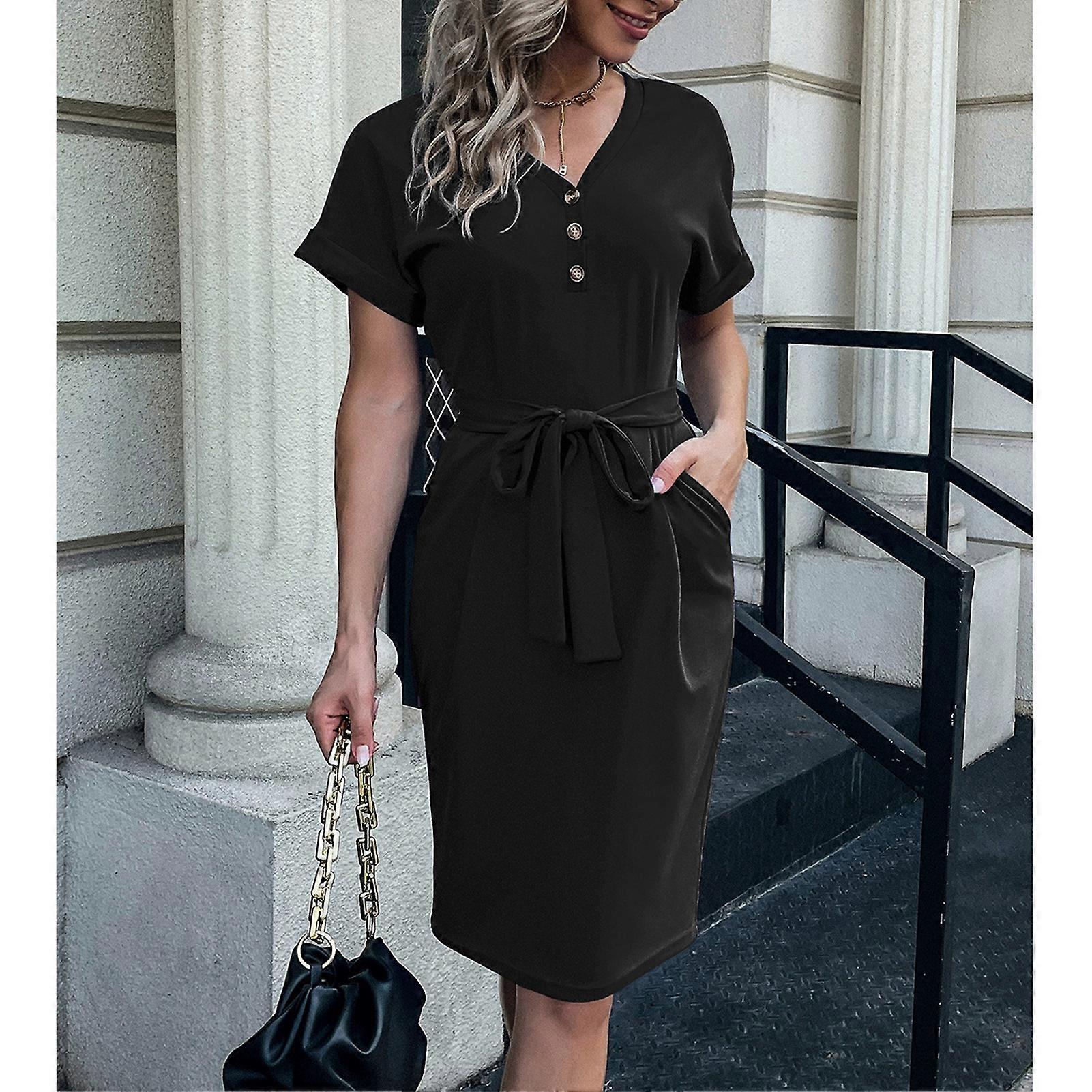 Short Sleeve Dress Women's Casual V Neck with Button Waistband Pocket Summer Clothing Black XL