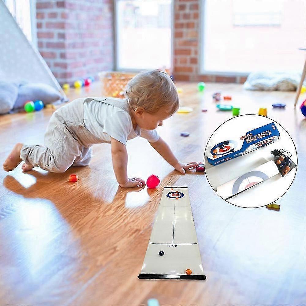 Tabletop Mini Curling Game Set Family Fun Board Games Shuffleboard Pucks with 8 RolllersThis curling game is an excellent tool to train kids hand-eye coordination, learn game strategy, basic physics and independent thinking. It plays smooth, the curling game has ball-bearings inside the plastic "stones". They simulate the relative weight of the stones, while the surface was slippery enough to produce the ice-like effect of easily sending the stones far.Features:This is a nice compact game for kids, takes up no space at all and includes a shiny rollout and 4 blue and 4 yellow stones.The curling game is very easy to install. Just find a flat place indoor or outdoor and open the box , then you'll enjoy the funny game.This tabletop game is a more-fun-than-it-looks board game. Adults and kids can play against each other and come out even.The curling game has ball-bearings inside the plastic "stones". They simulate the relative weight of the stones, while the surface was slippery enough to produce the ice-like effect of easily sending the stones far.Helps kids build hand-eye coordination, learn game strategy, and basic physics.Specifications:Material: ABS, PP, steelSize: 120*28cm/ 47.2*11inWeight: 350g/ 12.3ozPackage List:1 * roll up mat2 * magnetic strips8 * curling stones