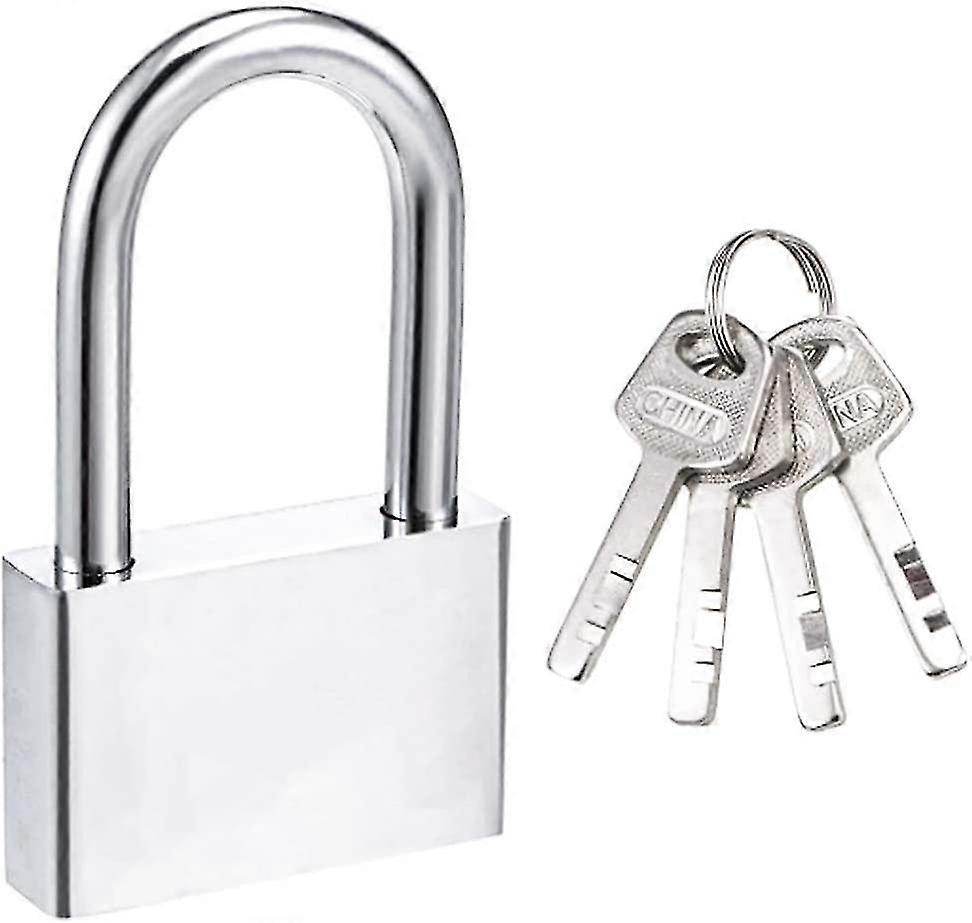 Padlock is made of solid hardened steel alloy Exterior chrome plating, With hard hook and loop, smooth surface, thick lock body, wear resistant provides security protection for your valuables _x005F_x000D_ Long shackle padlock is strong and lightweight waterproof, ideal for indoor and outdoor use, providing long-term protection _x005F_x000D_ Key padlock It is suitable for storage cabinets, gates, garages, containers, rolling gates, machinery or door locks to protect bicycles, garden tools, motorcycles or other objects from theft and destruction _x005F_x000D_ Security padlock adopts security and anti-theft locking core, which must be aligned with the locking core when unlocking Each padlock has a different key, so don't worry about others buying the same lock