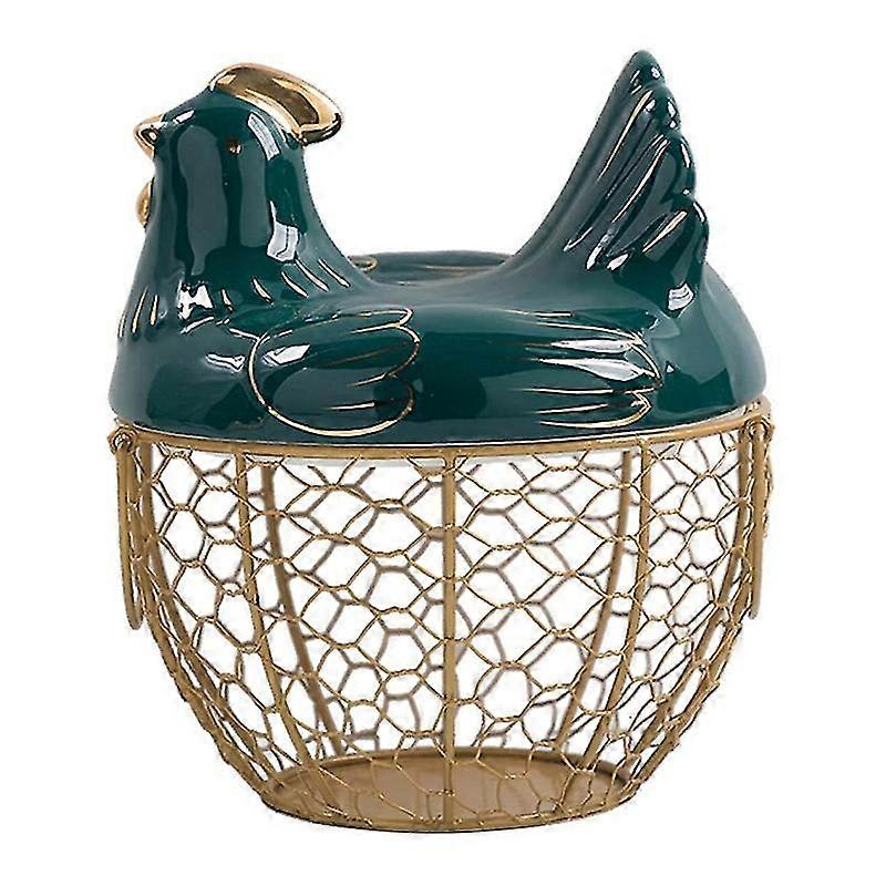 Egg Storage Basket Metal Wire Fruit Basket With Chicken Shape Lid Ceramic Egg Holder, Storage Holds