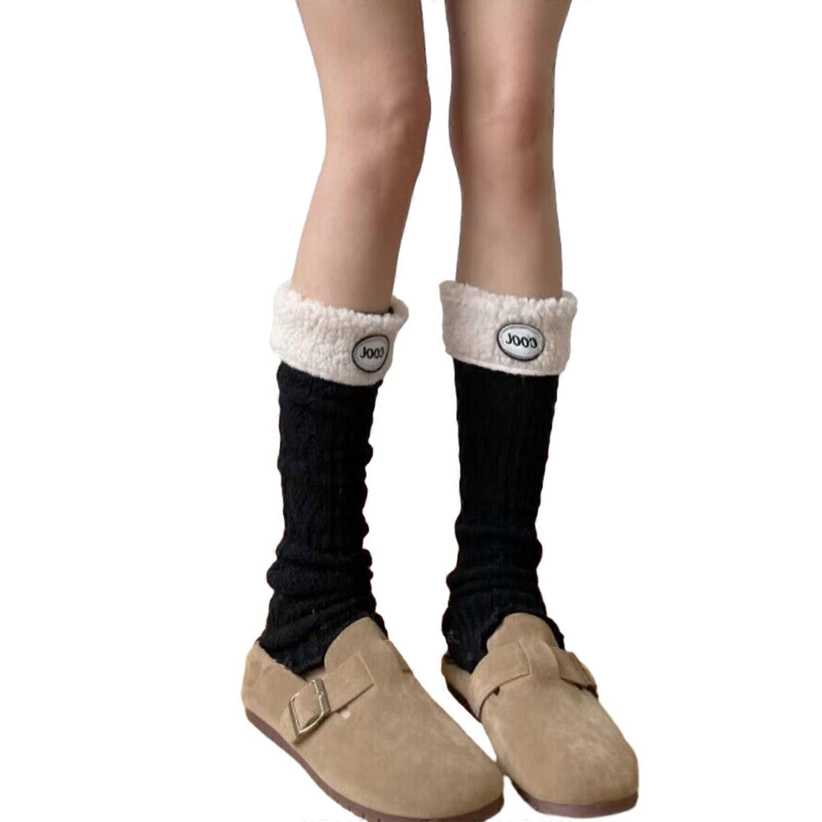 Harajuku Women Knitted Leg Warmer Long Socks Cute Furry Trim Letters Label Preppy Warm Foot Cover Boot Cuffs Stockings Black
