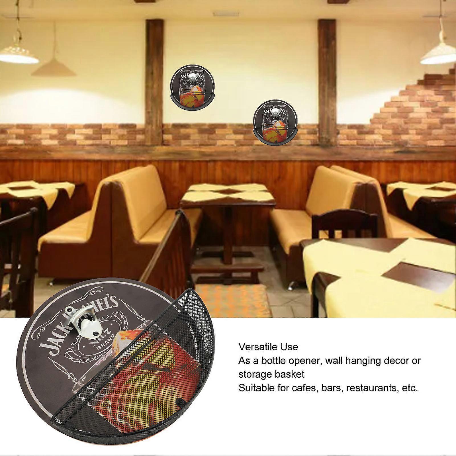 Wall Mounted Bottle Opener with Storage Basket Round Wood Panel Metal Beer Opener Vintage Decoration
