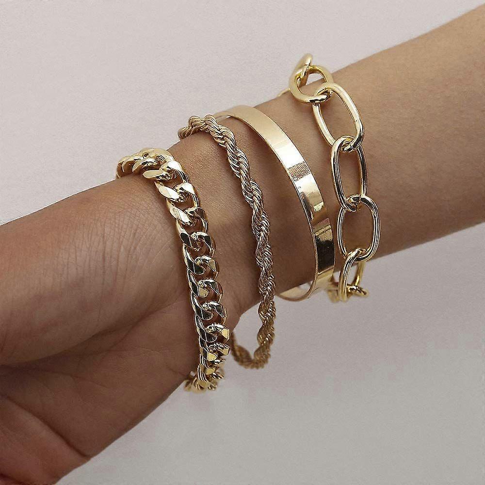Dainty Boho Gold Silver Chain Bracelets Set for Women Adjustable Fashion Beaded Chunky Flat Cable Chain Punk Bracelets Jewelry for Women Girls Gift Se