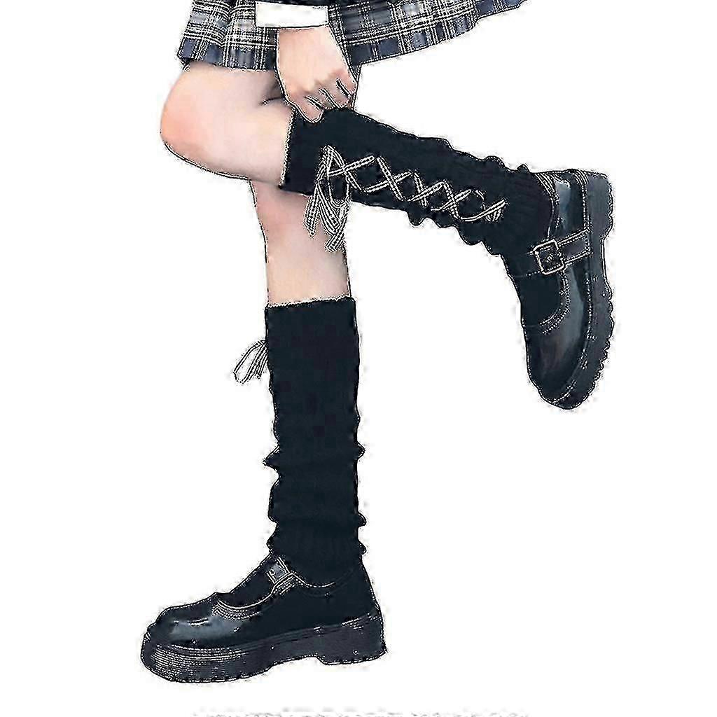 Japanese Style Women Cable Knit Leg Warmers Kawaii Striped Plaid Crisscross Ribbon Bow Loose Boot Cuffs Lolita Student Warm Calf Length Socks Stockin
