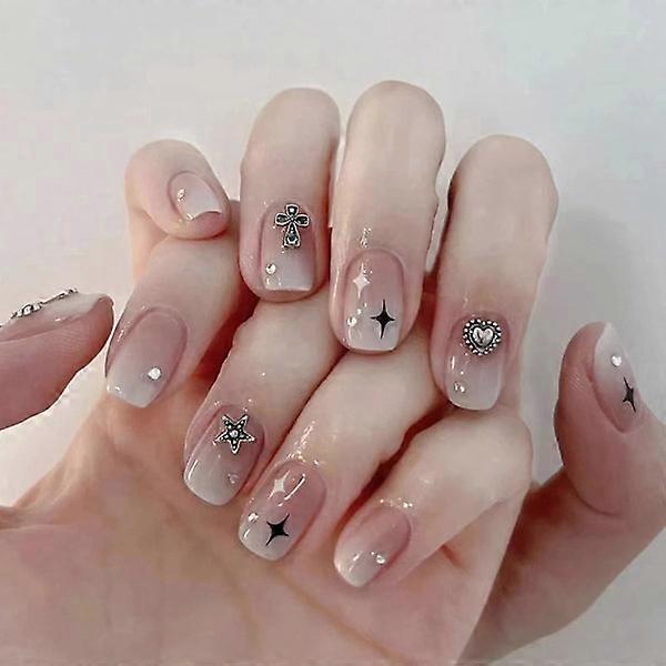 Square press-on nails, short shiny pink false nails, squoval diamond star acrylic nails, full cover false nails for women.