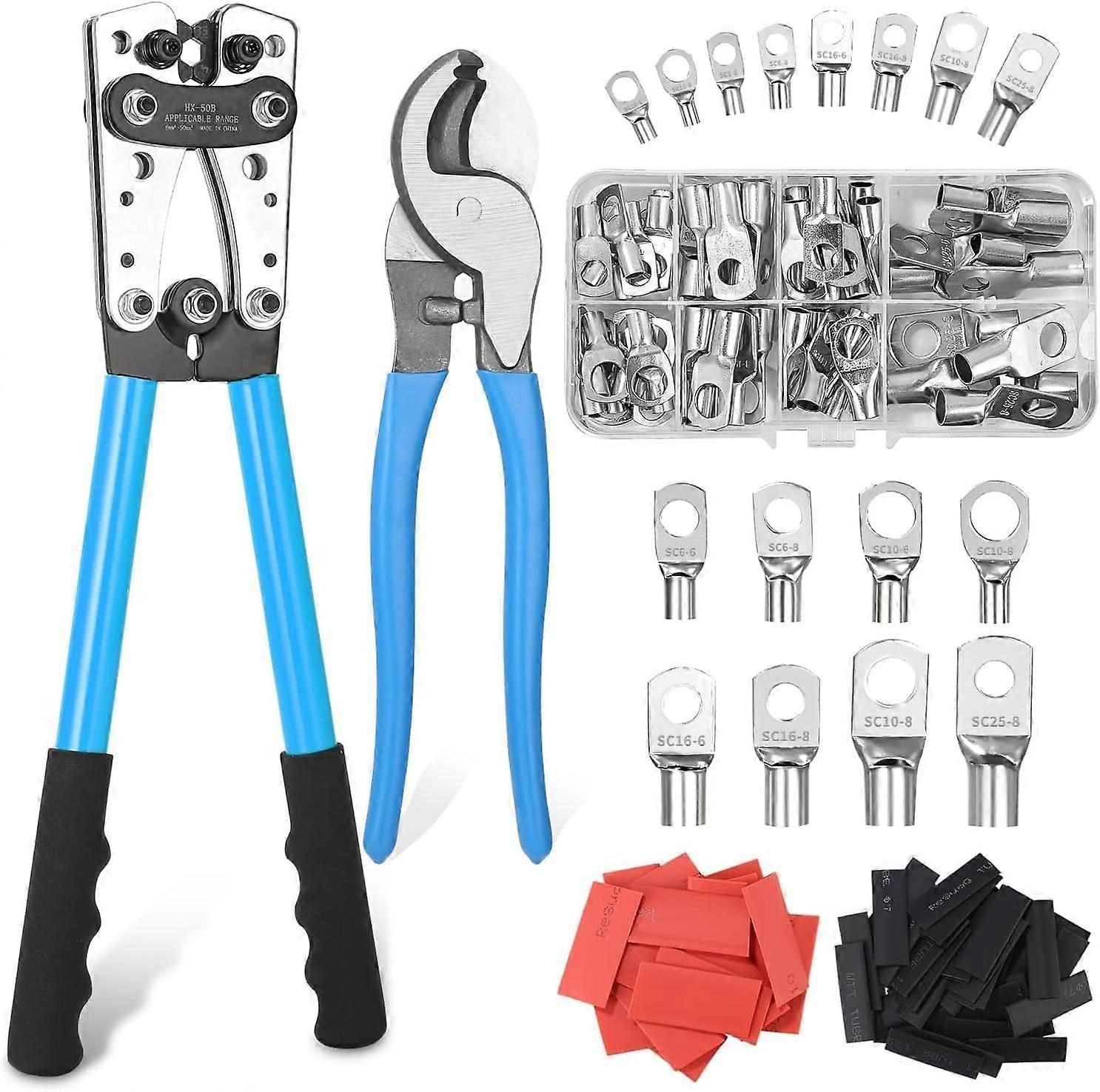 Crimping Tool,Large Battery Cable Crimper 10-1/0 AWG 6/10/16/25/35/50mm² with 8 Sizes 60PCS Copper Ring Terminals and Cutting Pliers + 60PCS Heat Shr