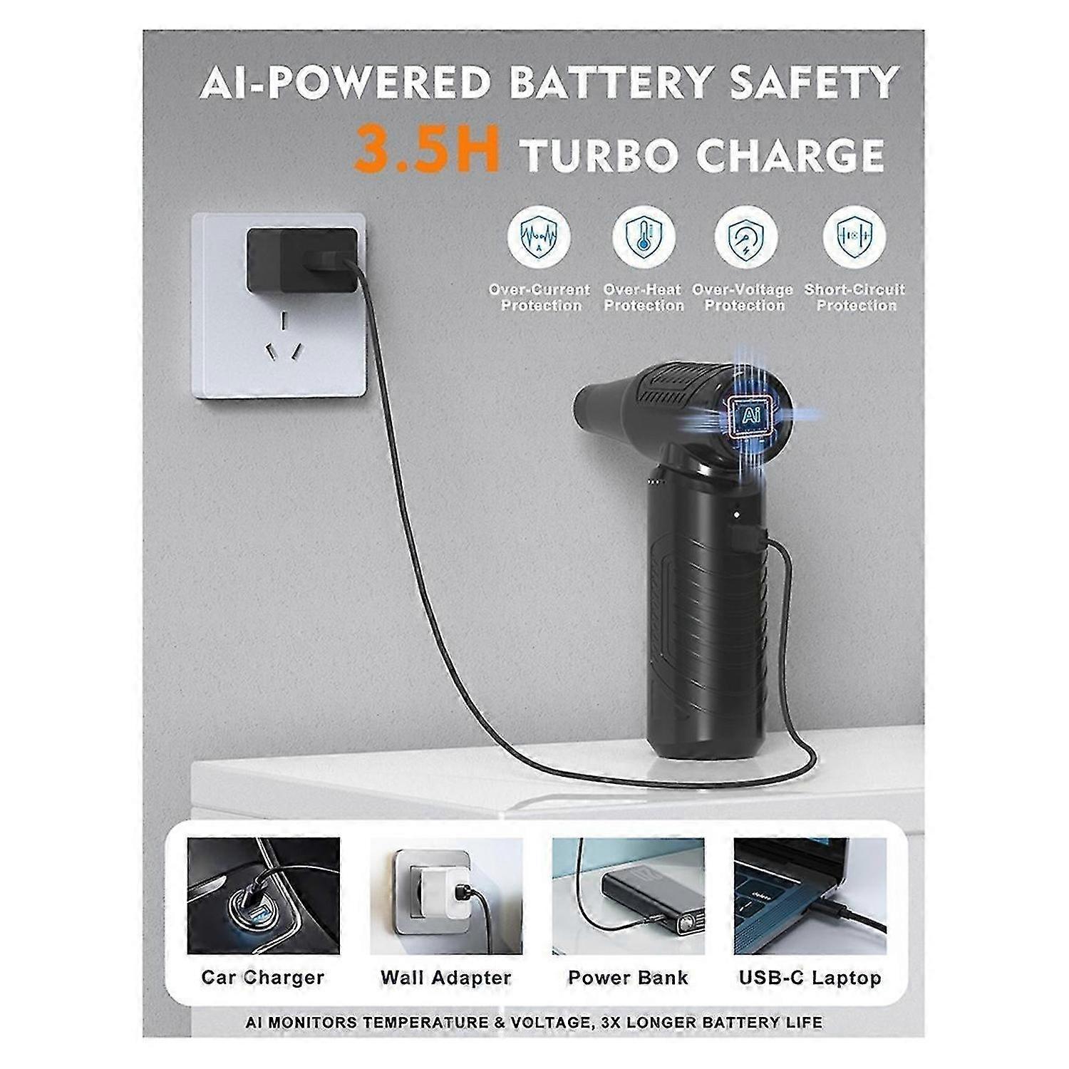 Unleash Powerful Cleaning: The W09B air duster operates at a mighty 130,000 RPM, making it more potent than many competitors. It's perfect for removing dust, crumbs, and debris from electronics and car . With three adjustable speeds, it ensures both gentle and deep cleaning without the risk of frost or liquid damage. Eco-Friendly & Cost-Effective: Say goodbye to disposable cans with our 7500mAh rechargeable duster. It charges fully in just 3.5 hours via a Type-C connection, providing up to 500 uses on a single charge. This makes it an ideal, sustainable choice for frequent cleaning tasks. Precision Cleaning with Pro-Grade Tools: This package includes five nozzles and three brushes, designed to tackle hard-to-reach areas like laptop vents and intricate car components. The ergonomic design promotes a comfortable grip, making prolonged cleaning sessions less strenuous. Safe for Sensitive Devices: FCC-certified for safety, our electric duster features temperature control and short-circuit protection. Its brushless motor operates quietly and efficiently, ensuring that your delicate gadgets are cleaned without risk of damage. Versatile Beyond Cleaning: Not just for dusting, this air duster can also inflate pool floats, BBQs, and refresh home decor. and compact, it's perfectly suited for travel, workshop tasks, or quick cleanups anywhere around your home or vehicle.<br><br>Color: Black Material: ABS<br><br>Package Contents: 1 * Dust Blower 1 Set * Accessories<br><br>Only the above package content, other products are not included. Note: Light reflection and different displays may cause the color of the item in the picture a little different from the real thing. The measurement allowed error is +/- 1-3cm.
