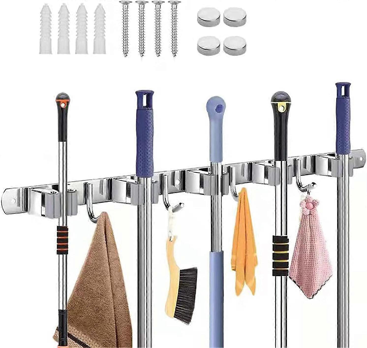 Wall Mounted Broom, Stainless Steel Wall Mounted Broom Holder With Five Slots And Four Hooks, Wall Mounted Broom Holder Suitable For Bathroom, Kitchen
