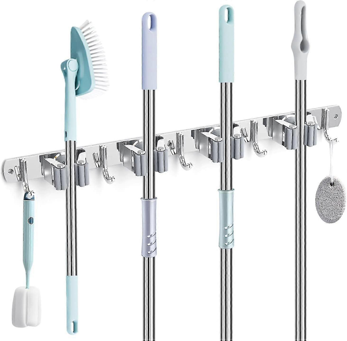 Wall Mounted Stainless Steel Broom Holder Broom Mop Self-adhesive Tool Holder Organizer With 4 Holders And 5 Hooks For Home
