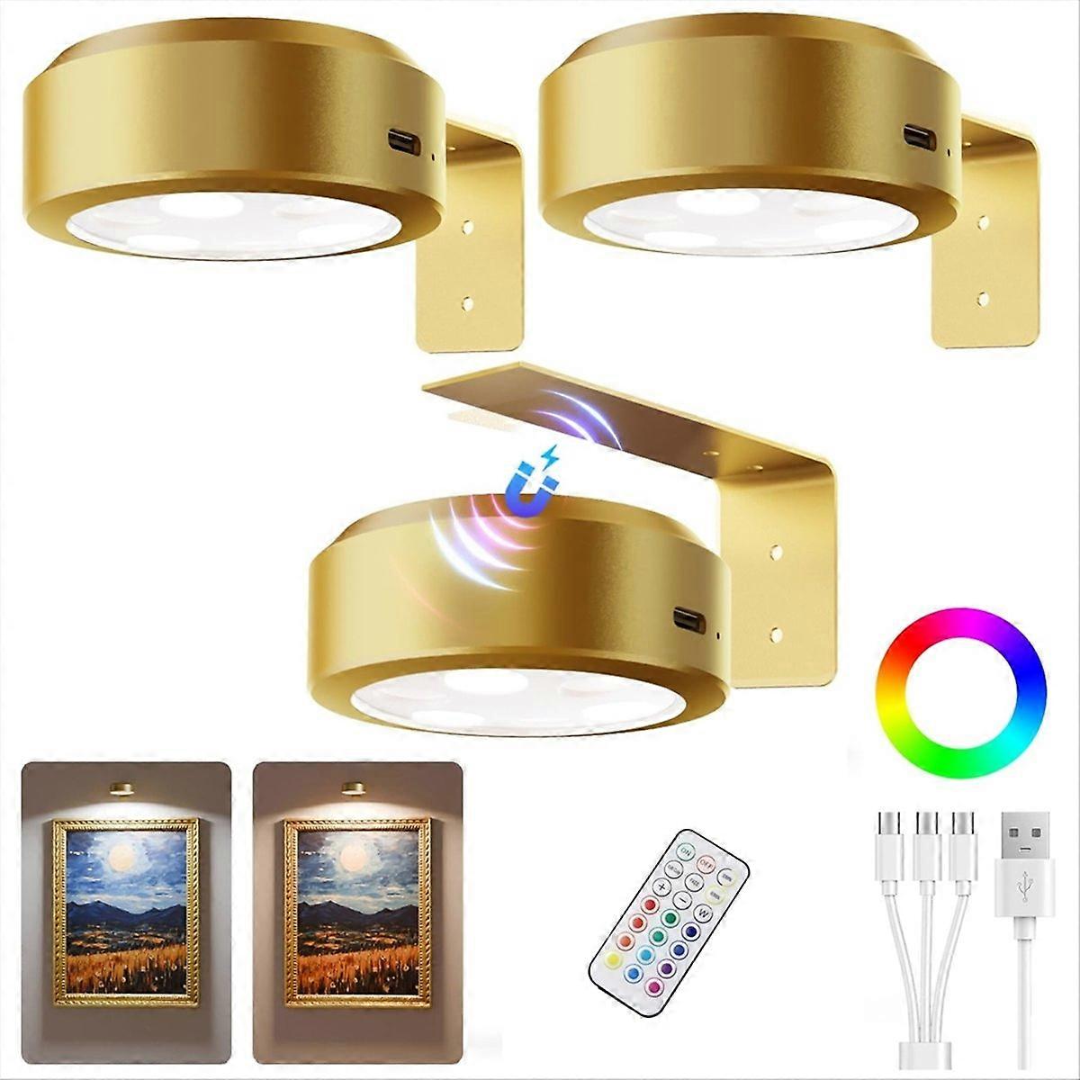 [1500mAh Long-Lasting Rechargeable Battery]wireless picture light uses 6 energy-saving LED lamp beads (others: 4 lamp beads), with built-in 2000mAh large-capacity battery, low power consumption and long lasting durability. Equipped with Type-C high-speed charging cable, fully in 2.5 hours. [3 Color Temps & 12 RGB Modes]lights for pictures on wall offers 3 color temps (3000K/4500K/6500K) as well as 12 RGB colors, making it perfect for illuminating your space. which smoothly itions between colors and brightness. rechargeable light can meet your needs for both daily use and holidays. [Adjustable Brightness & Timer Function]Ideal for enhancing your environment, wireless art light provide adjustable brightness from 10% to for each color and feature three timer settings (15min/30min/60min), all conveniently controlled with the included remote. [Tap & Remote Control Modes]Easily control your painting lights for wall cordless with the included remote, or tap the lampshade to turn them on/off and adjust colors. Perfect for convenient and versatile lighting management. [Widely Application]rechargeable picture lights suitable for decorating picture frame, artwork,poster, portraits, wall art and so on. This display lights for artwork provides precise lighting for small-sized p o frames 4 x 6inch, 4 x 8inch, 4 x 10inch, 6 x 10inch, 8 x 10inch, 8 x 12 inches. Color: Gold Material: plastic Package Contents: 3 * lights 1 * remote control 1 * USB cable 3 * brackets Only the above package content, other products are not included. Note: Light reflection and different displays may cause the color of the item in the picture a little different from the real thing. The measurement allowed error is +/- 1-3cm.