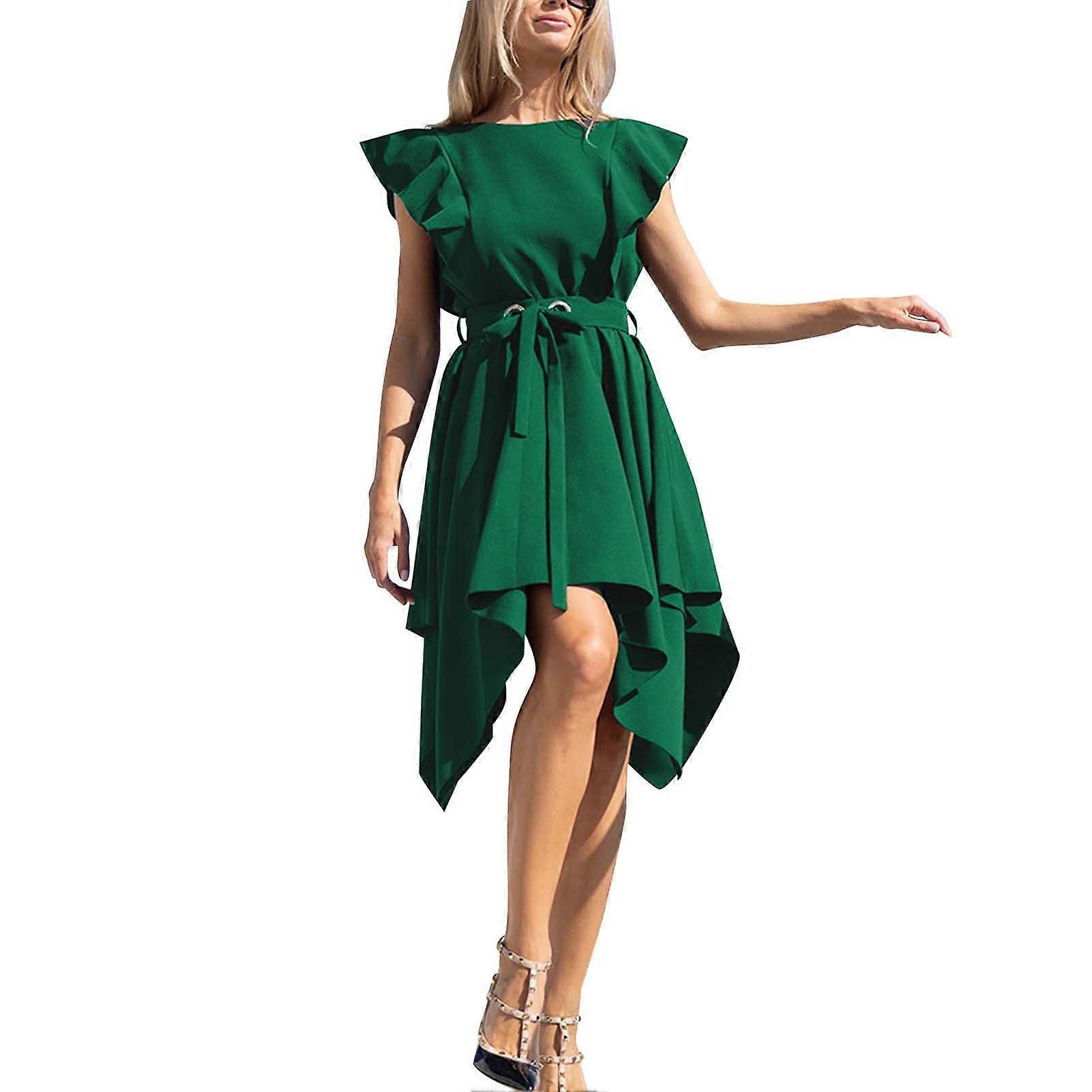 Summer Ruffle Sleeve Dress Women Elegant Pure Color Crewneck Wrap Hem Belted Midi Dress for Daily Work Green M