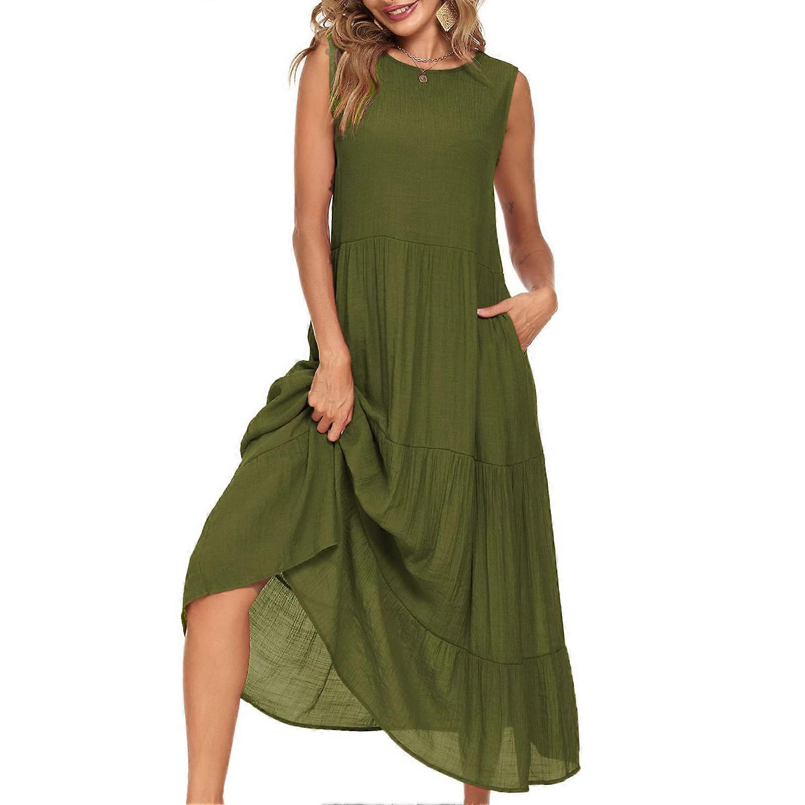 Summer Ruffle Hem Sleeveless Dress Loose Pure Color Crewneck V Neck Tiered Tank Dress with Pocket Type 5 XL
