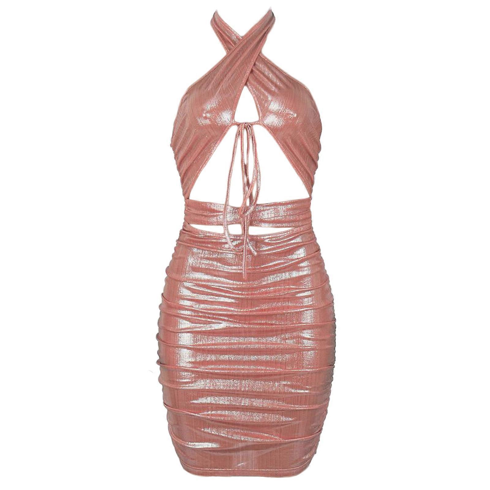Summer Bodycon Solid Color Dress Backless Sleeveless Hollows Criss-cross Outfits Ruffle Short Leg Length Dresses Pink XL