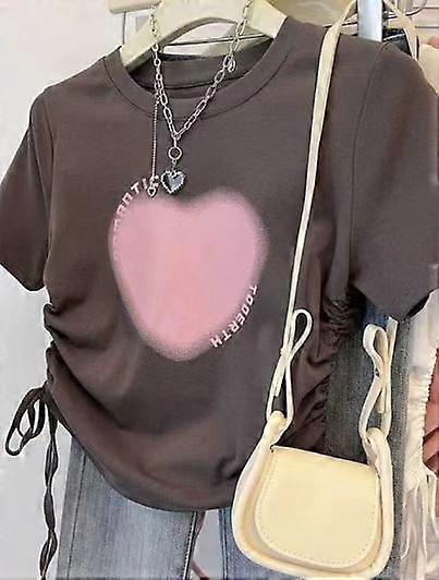 Short-Sleeved T-Shirt For Women In Summer Korean Style Slim Hot Girl Drawstring Design Love Printed Round Neck Short Casual Top