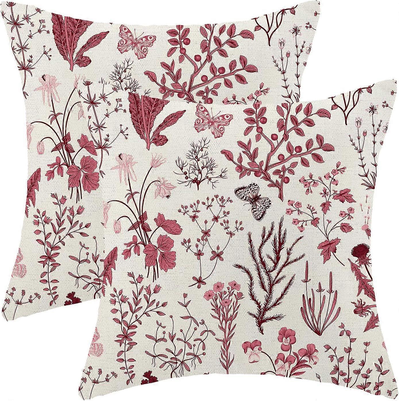 Summer Pillow Covers 18x18 Inch Set of 2,Burgundy Red Wild Flower Plant Throw Pillows Case,Seasonal Floral Outdoor Decorative Square Linen Farmhouse D