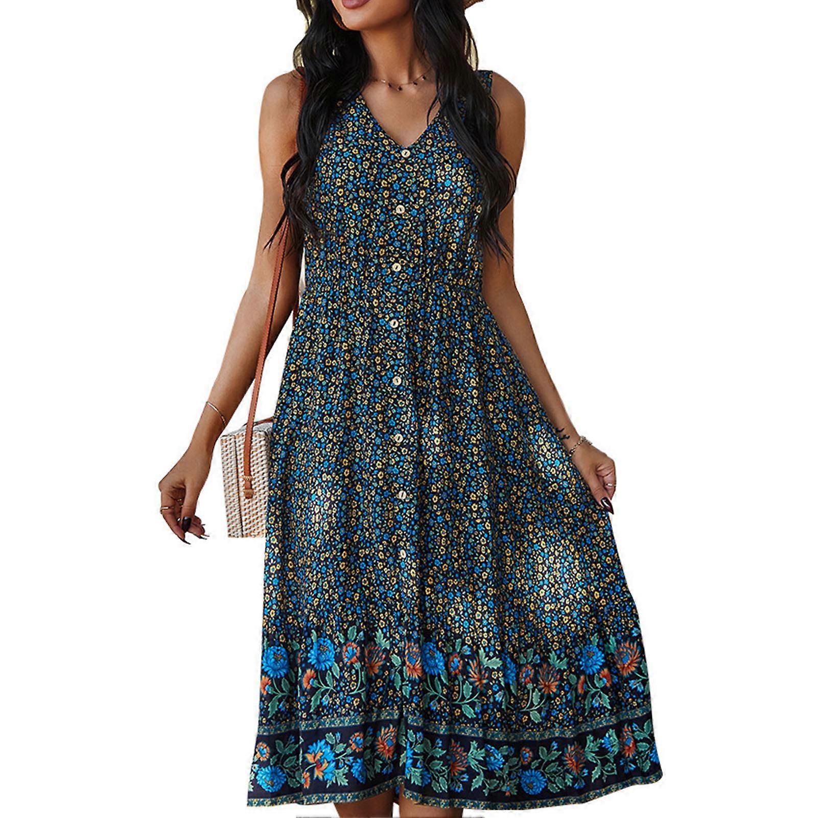 Summer Floral Dress Sleeveless V Neck Elastic Waist Ruffle Hem Women Midi Casual Dress for Beach Vacation Dark Blue XL