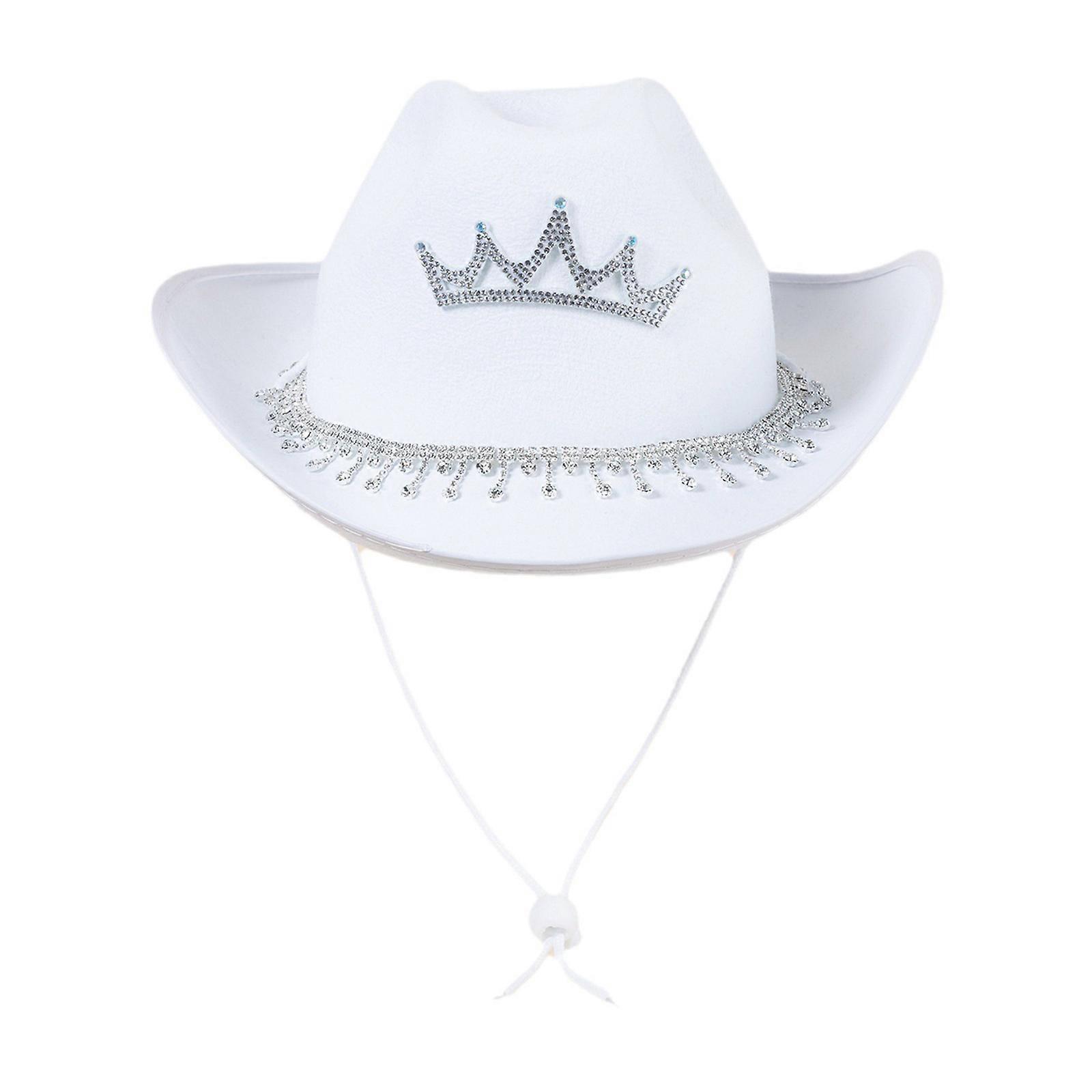 Summer Breathable Cowboy Hat Western Style Large Brim Hat Casual Sunproof Hat with Rhinestone Crown Design&Chin Strap White