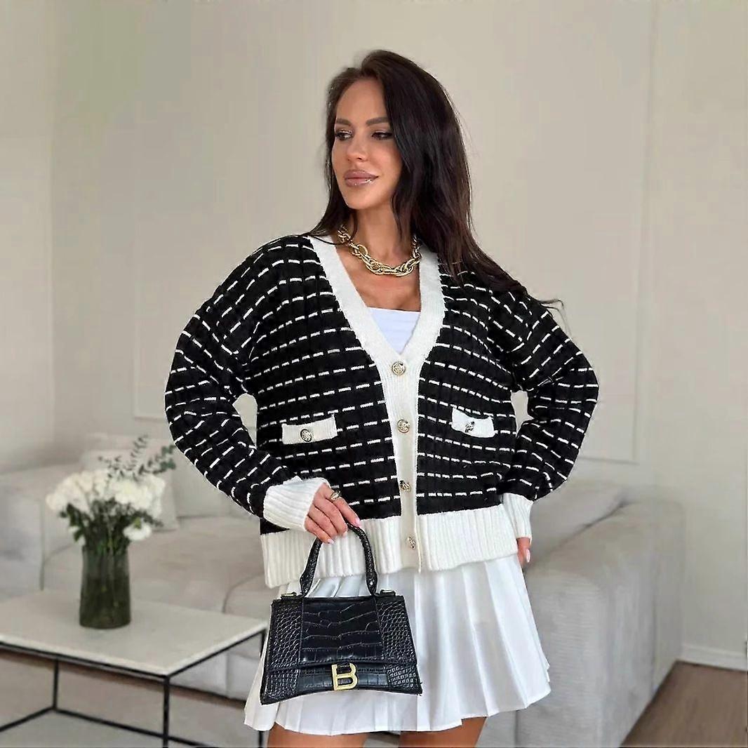 Summer wb women's fashion black and white striped knitted cardigan women's black and white pocket jacket knitted sweater