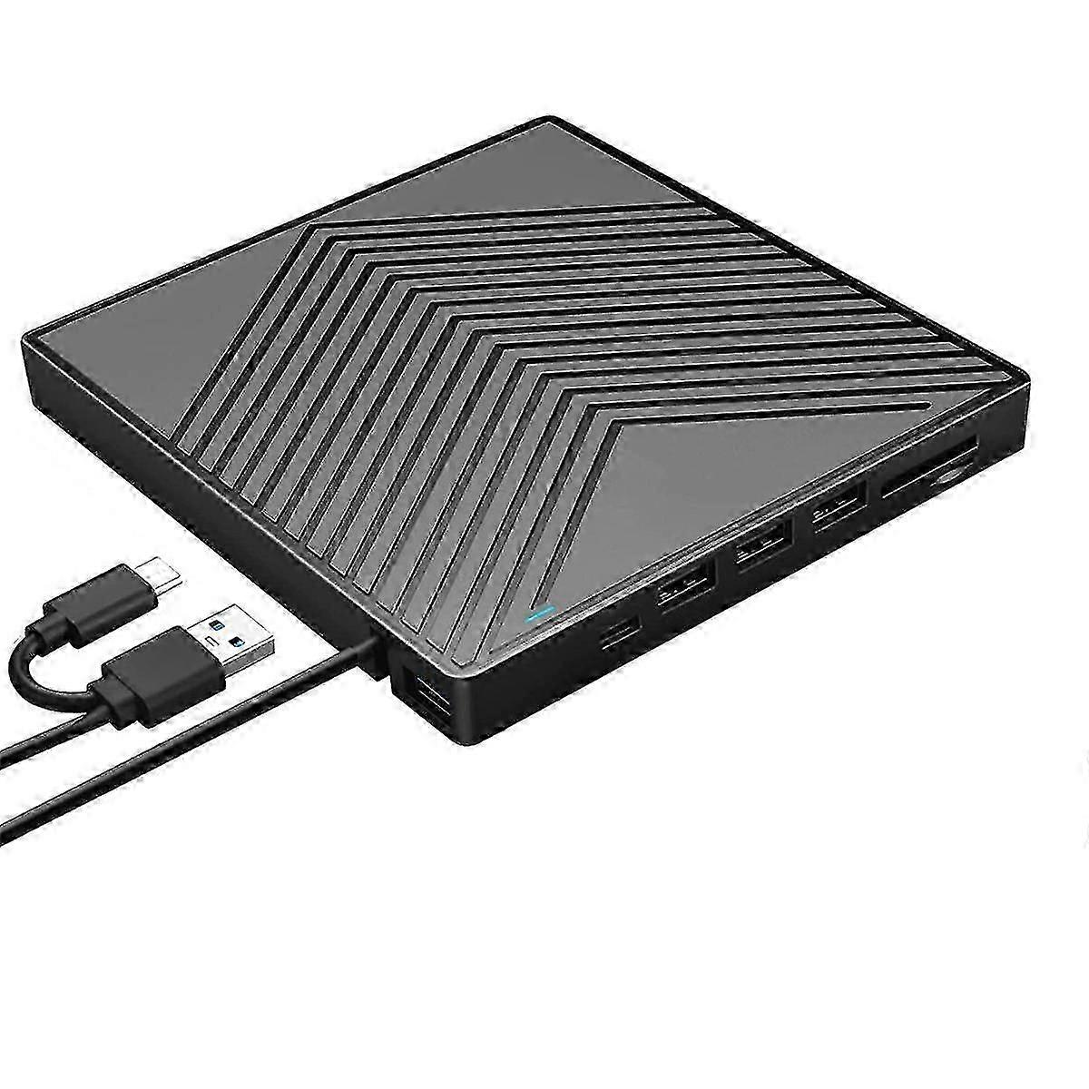 Description [CD DVD Reader Burner]After the device is installed, you can use this external CD/DVD RW drive to complete various tasks such as watching , burning/ripping CDs , installing software/ system/ games, backing up data to discs through the corresponding software. Compatible with multiple discs including CD-ROM, CD-R, CD +/-RW, DVD-ROM, DVD-R, DVD+/-RW, DVD-R DL, VCD-ROM discs.[High-Speed Performance]Equipped with a faster USB 3.0 connector and featuring the strong error-correcting, low impedance, and anti-interference , you can use this USB CD/DVD drive to read and write CDs and quietly without stuttering and noise, and damage your discs (Max Read/Write Speed: 8xDVD /24xCD)[Extra 6 IN 1 USB HUB]- Its not only an external CD/DVD reader and writer, also a USB hub with 4 USB ports, 1 SD slot, and 1 -USB reader, you can simultaneously hook up other external devices such as USB flash drive, SD/TF card, external hard drive, etc., which will effectively solve the of insufficient USB ports on a computer. (Note: SD and -SD slot cannot be used simultaneously)[Wide Compatibility]Compatible with Multi-OS including Windows 11/10/8.1/7/Vista/XP, Linux, and all versions of OS, so you can use this external optical drive on most computers including Pro, , , Mini, Windows laptop and desktop PCs[No Adapter Required]This portable CD/DVD drive is equipped with USB 3.0 and USB-C two kinds of connectors on the back, you can to use this external drive without a USB-C adapter or hub required.color:BlackMaterial:plasticPackage Contents:1 x External DVD DriveOnly the above package content, other products are not included.Note: Light reflection and different displays may cause the color of the item in the a little different from the real thing. The measurement allowed error is +/- 1-3cm.