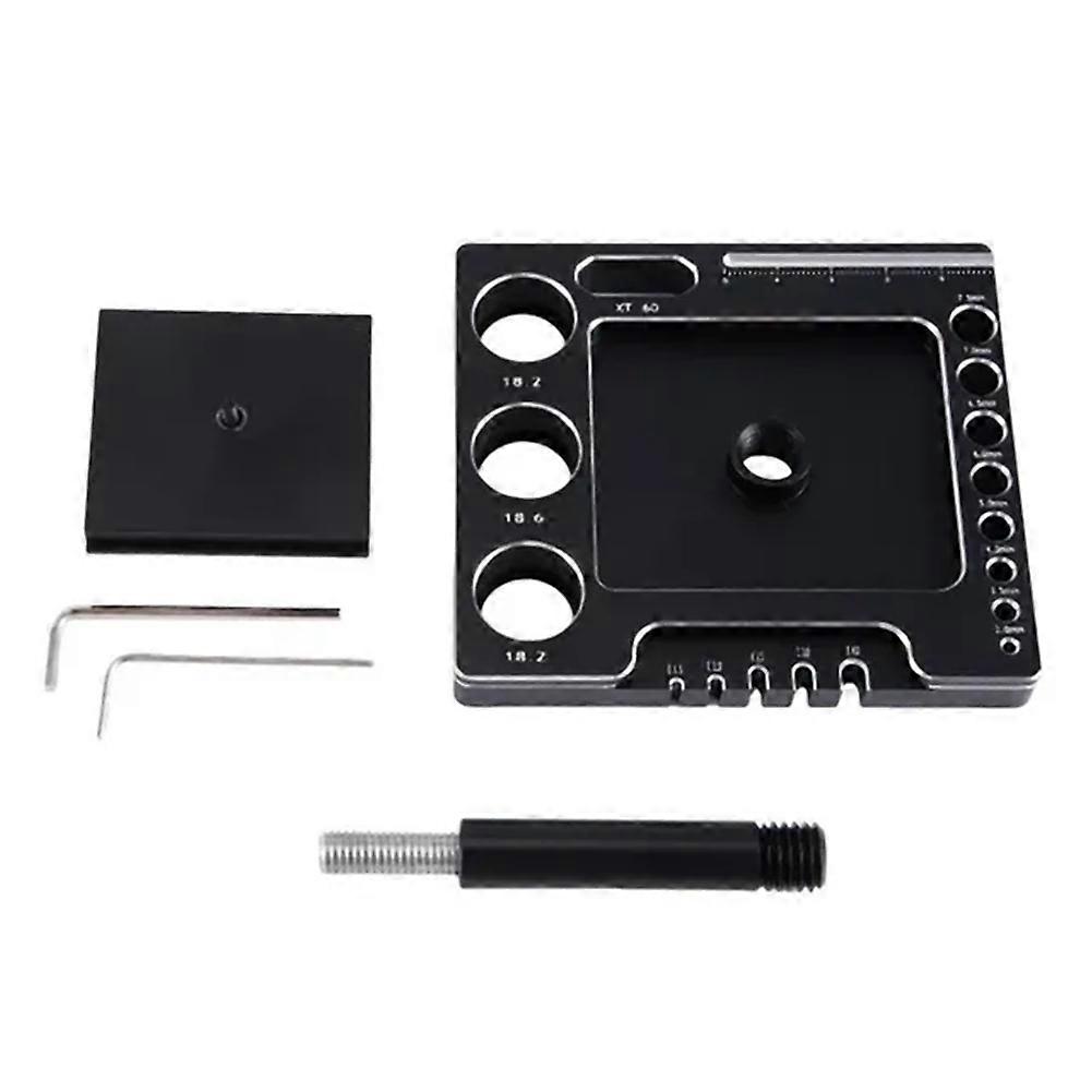 [RC Car Stand] Fits 1/10 1/12 1/14 1/16 1/18 1/24 RC Car Truck Crawler, such as for Axial FMS Arrma Redcat MN and many more. [Adjustable] RC Repair Stand can be rotated 360 degrees, height adjustable from 85mm/3.35in to 120mm/4.72in, adjustable service bracket allows you to find a comfortable position to service your RC Car. [Multi-function] RC Work Stand has 2 x 18.2mm and 1 x 1.86mm holes on the bottom for screwdrivers, RC car parts, repair accessories, repair tools and more. The chassis has a scale for measuring the length of parts. [] Multi-function remote control bracket is designed for small vehicles and integrates the functions of a screw tray, a plug welding station and a screw measuring scale. The design of the plug welding station and screw scale will make your repair work more efficient. [Good Choice] This Small RC Repair Stand will meet all your needs for repairing RC cars and can also be given as a gift to your friends who like RC models. Name:Multi-function RC Car Stand Colour:Black Material:Metal Package Contents: 1 x RC Car Stand Only the above package content, other products are not included. Note: Light reflection and different displays may cause the color of the item in the picture a little different from the real thing. The measurement allowed error is +/- 1-3cm.