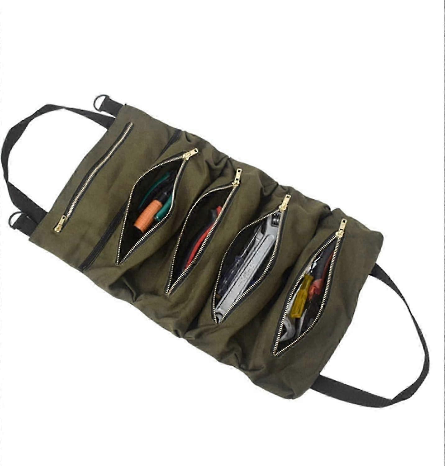 Multi-Purpose Canvas Tool Roll Bag with 5 Pockets, Zipper & Hook for Car Seat Back