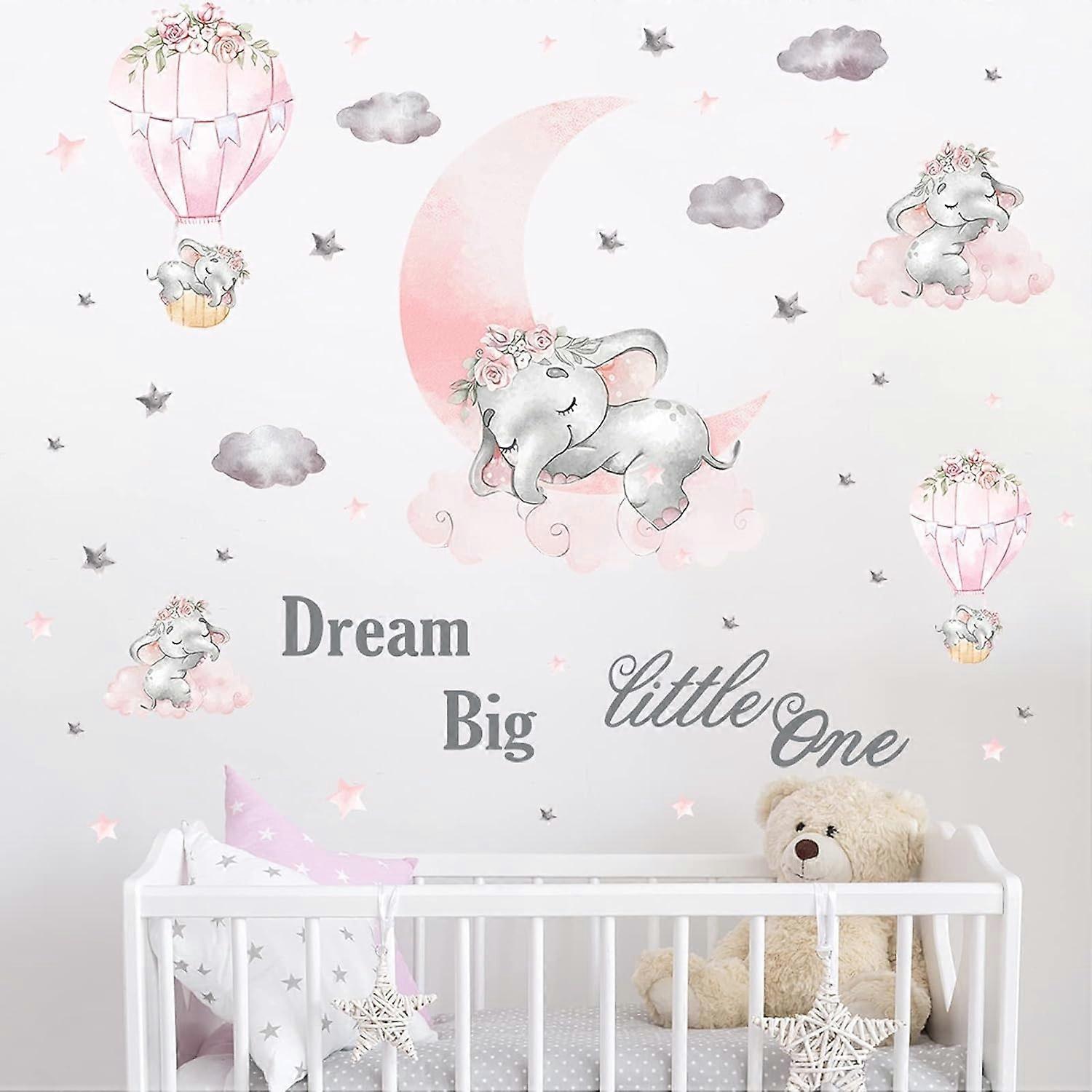 Large Baby Pink Elephant Wall Decals, Cute Five Elephants Gray Moon Star Clouds Pink Wall Decals, Ba