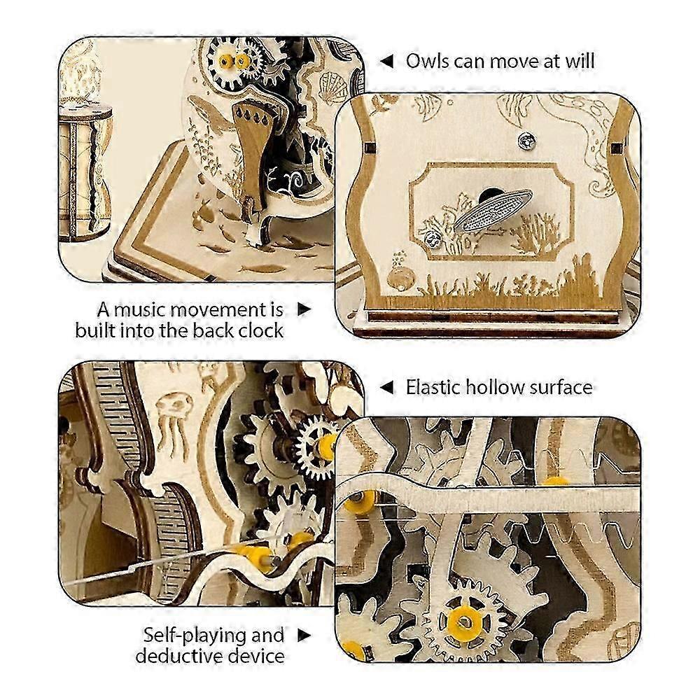 Description Feature: 1. Classic Cello DesignThis music box features a classic cello design, meticulously crafted with precision and complexity. The multi-level gear assembly and mechanical transmission ensure smooth and stable operation, bringing a sense of coordinated between movement and stillness. 2. Wooden DIY 3D PuzzleThe cello music box is a wooden DIY 3D puzzle that provides a fun and challenging assembly experience. The mortise and tenon craftsmanship ensures a perfect fit for each piece, allowing you to enjoy the satisfaction of assembling it by hand. 3. Creative Display PieceNot just a music box, this cello model also serves as a creative display piece. The elastic hollow curved surface and self-playing device add a unique touch to your home or office decor. 4. Interactive FeaturesThe music box comes with interactive features for added fun. The owl can be moved around freely, and the back of the clock is equipped with a music movement, adding a dynamic element to this static piece. 5. Ideal Present ChoiceThis dynamic music box makes an ideal present for holidays or special occasions. Its a piece of art that stimulates the mind and brings joy to the heart. Specification: Product Material: Wood Production Process: Laser cutting and carving Number of Accessories: 177 Product Size: About 17.8 * 14 * 25.7cm/7 * 5.5 * 10.1inch Packaging Size: About 32 * 24 * 4cm/12.6 * 9.4 * 1.6inch Package List: 1 * DIY Music Box
