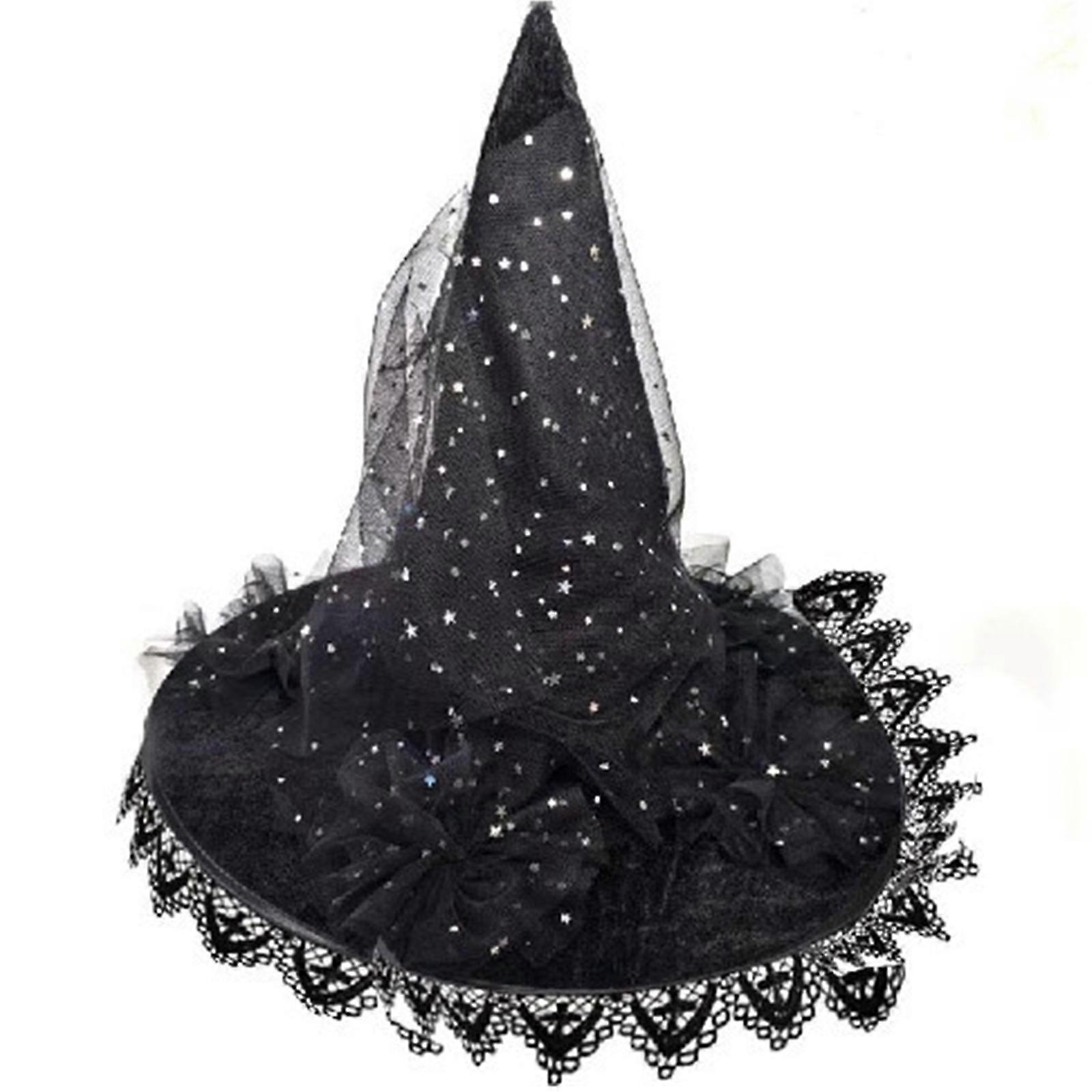 Halloween Witch Hat for Adult Unisex Lace Trim Wizard Hat Roleplaying Pointed Hat Theme Party Dress Up Star Witch Hat Black