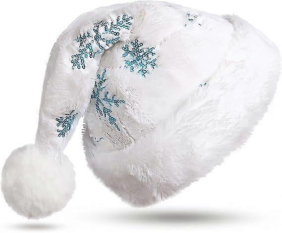 [PREMIUM WHITE PLUSH CHRISTMAS HAT] This Christmas hat is made of high density plush, soft and comfortable; Its soft linings are comfortable and warm to wear. They are very comfortable for long term wear. Suitable for long-term wear. This high-quality plush Christmas hat is a good choice for the upcoming Christmas. [SPARKLING BLUE SNOWFLAKES]The plush white Christmas hats are embellished with blue glitter snowflakes; sequins can reflect the light of Christmas lights, shining and dazzling, enrich the Christmas atmosphere well; White plush hats and sparkling Blue snowflakes weave the beauty of winter. [EXCELLENT CHRISTMAS DECORATION] This new white Santa Claus hat is suitable for various occasions, such as: Christmas, Halloween, New Year, cosplay, parties, birthdays and even promotions, community events, annual celebrations, stage performances and holiday parties, etc. . [IDEAL FOR FAMILY GATHERINGS]High-quality, neat surface, tight lines, sequins, high-quality plush Christmas hats. Thanks to the white plush fabric and comfortable lining, the Santa Claus hat will protect your head and hair and keep you warm this winter. This is the best gift for family and friends. [SUITABLE FOR ADULTS AND TEENAGERS] In order to make this Santa hat suitable for most people, we adjusted the size to 31cm (width) x 43cm (height). Suitable for people with a head circumference of 50cm ~ 62cm. This plush Christmas hat is suitable for adults and teenagers, and can meet the different needs of your family. Quantity:1pc
