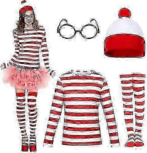 Adults Wally Costume Set, Red White Stripe T-shirt, Hat, Glasses, Socks Outfit Set World Book Day Halloween Fancy Dress For Men