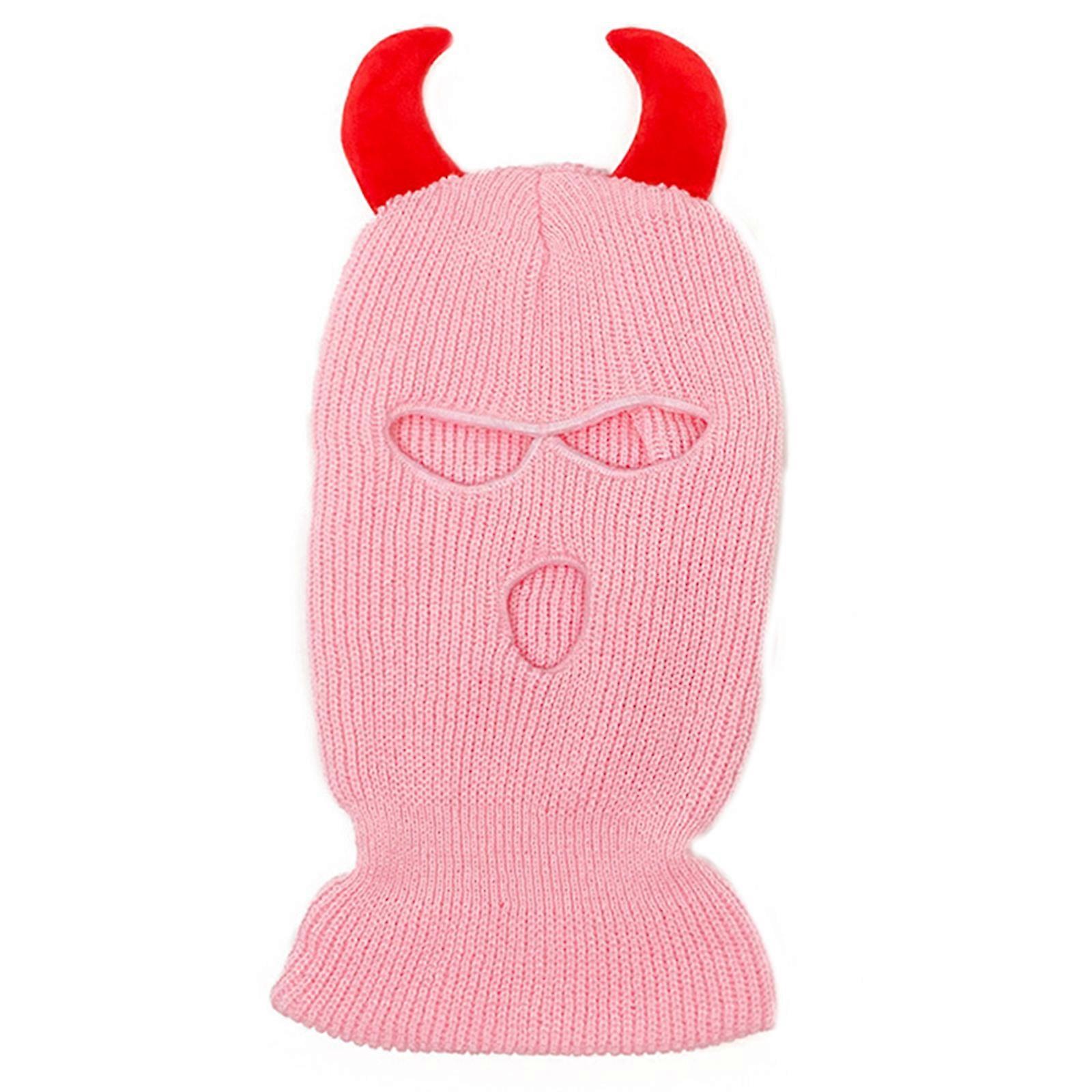 Devil Horn Winter Hat for Adult Handwoven Balaclava Caps Outdoor Activity Hat for Skiing Knitted Mask Hat Cool Accessory Pink