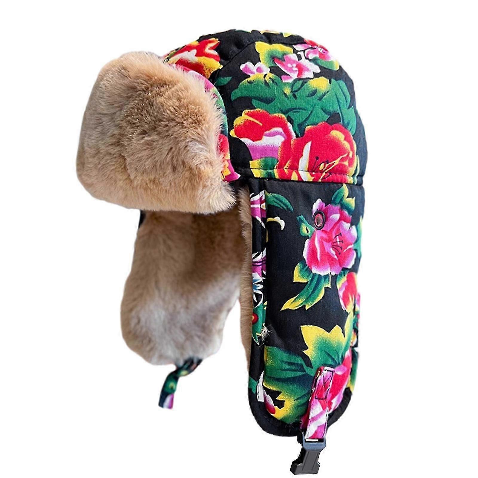 Bomber Hat for Adult Warm Ear Flap Earflap Hat Big Floral Print Aviation Cap for Men Women Outdoor Sports Skiing Hat rose red Cs