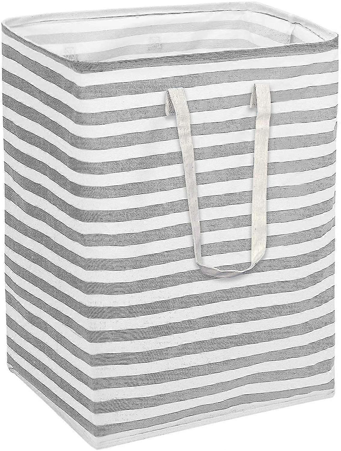 1.Extra Large Laundry Hamper: Clothes hamper measures 11.8 x 15.7 x 24.4 , 30cm x 40cm x 62cm (W x L x H), volume: 75 L. Tall laundry basket helps organize kids toys, dog toys, linen, blankets, and the nursery, also excellent baby hamper.2.Upright Laundry Hamper: Gray hamper use high quality canvas cotton With rigid iron wire rims sewn into the top edges, it will stay upright and standing, even when empty. Just stretch out the hamper basket and it will stand on its own,then you can free your hands to do more things.3.Waterproof & Moisture-proof Funtion: The dirty clothes hamper use waterproof coating insidecanvas cotton, the inner wall of the laundry hampers is designed with a waterproof coating. On the one hand, it prevents items from keeping dry during storage. On the other hand, when you put wet items in the basket, the leak-proof cotton ensures that no water will leak out. It is a good storage space for wet clothes at home, keep the laundry room dry and clean.4.Long Handles & Light weight: Laundry hamper with handles for convenient carrying with one or two hands, also it is only 402g with big capacity,Lighter than traditional wooden laundry baskets, thick cotton or linen hampers, or metal handles,So you can easily go up and down the stairs or put it in the laundromat while carrying the bag,will not feeling too heavy to carry.5.Collapsible Design: Foldable laundry basket is easy to folds up to store when not in use. Not only suitable for washing shop and family use, also Ideal for college dorms, campers, apartments, hotel use, baby nurseries, utility room, and shopping. NOTE: Simply use a wet cloth to wipe off the dirt or rinse off dirt under cold water, Do not clean in washing machine and dryer.