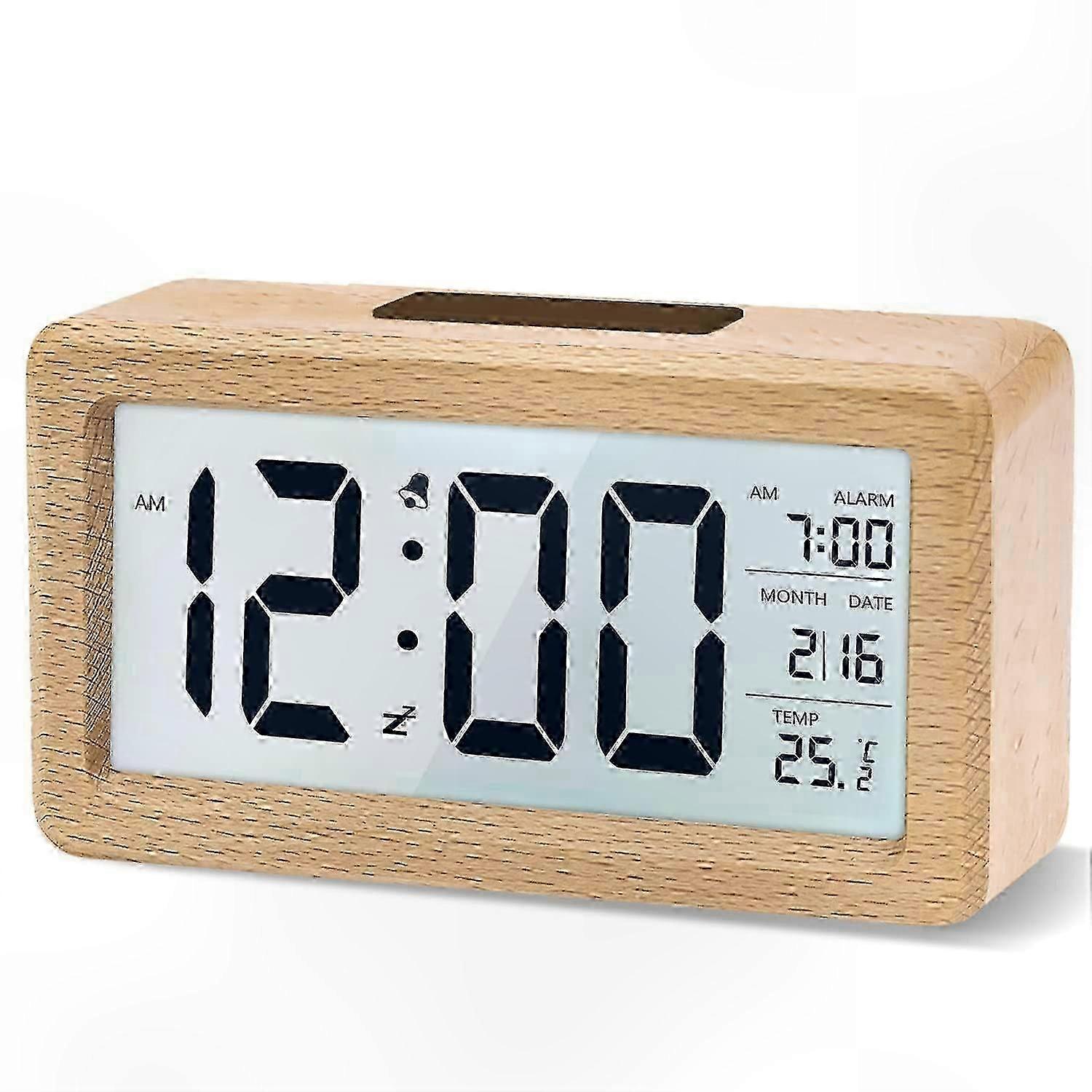 Wooden Digital Alarm Clock with Large LCD Backlit Display, Temperature Reading, Snooze Function, Brightness Sensor, Operated by 3 AAA Batter