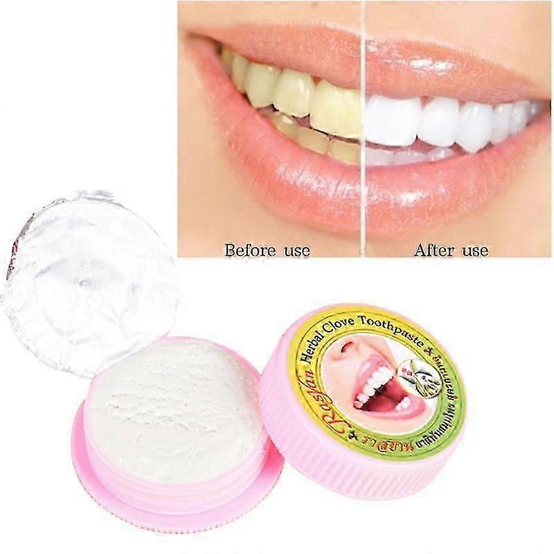 Description: Ingredients: Thai herbs such as asteraceae (compositae).lauraceae.mentol. clove oil.camphor.borneol camphor.sodium lauril sulphate. no preservatives. Clove: The results of cardamom It is spicy fragrance contains essential oils 5-9 percent effective in carminative and inhibitory the growth of some in a blood drive for the elements, the wind, turn off the element. Close the elements, the wind, phlegm The wind appetizing treat pyorrhea bloated tightly inflated. The wind League The results of cardamom, dried Used as a spice. Menthol: Use for sterile.>Menthol - is an extract of peppermint oil , which is derived from the plant Mentha piperita external use only about reducing pain sterilized and used as a carminative. Camphor: Used as a mild antiseptic. Borneol Camphor: Help mouth fragrant , Treatment of mouth ulcers , make Mouth and throat fresh & cooling. Function 1. Reduce gum swelling/ gingivitis (inflammation of the gums) 2. Bleeding gum 3. Tartar (a hard calcified deposit that forms on the teeth and contributes to their decay.) 4. Bad breath 5. Whitening teeth 6. Works as Anti-dirty The toothpaste you would know the difference after use. Herbal Clove Toothpaste helps eliminate limestone from cigarette, tea, coffee and whitening teeth. Reduced to have a hypersensitive tooth and Anti . You will have a long lasting fresh breath Package Included: 1x Toothpaste