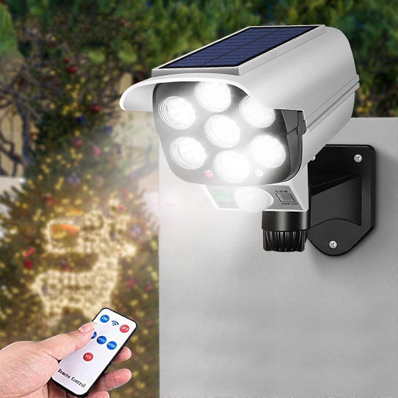 Solar Powered Human Sensor Security Fake Dummy Camera with Flashing Led Outdoor Use for Garden & Business Feature: Quantity: 1pc Color: White. Material:ABS plastic + electronic components. Product size: 19.5x10.4x9cm/7.68x4.09x3.54in Package size: 19x12x12CM/7.87x6.3x3.54in Net weight: 300g/0.66lbs Gross weight: 340g/0.74lbs Control : light control+induction+remote control. Charging :solar charging. Lithium battery:3.7V 2400mAh. Number of LEDs:77led. Time delay:15-20 seconds. Action angle:120 degrees. Working temperature:10-6014-140 Descrition: 77 LEDs Super Bright EffectsThis LED solar light powered outside light is built-in 77 Super LEDs .Therefore, it can provide ultra-high brightness light for a wide area and brighter to your garden, parking lot, garage, and etc. HIGH-SENSITIVITY PHOTOSENSITIVE DEVICE: This solar light works with sensitivity photosensitive device, which can sensitively sense moving objects in 16 ft with 120 degrees range. It can ensure you in dark environment and it can also remind to the thief as a solar security motion lights outdoor. 3 Lighting ModesThis motion sensor solar led light has 3 lighting modes: Mode1: Motion Sensor full brightness light. Mode2 : Low level brightness + full brightness light of motion sensor.. Mode3: Constantly glowing at medium brightness in the dark Easy to choose mode through button or remote to meet your different requirement,let you enjoy a more convenient . IP65 Waterproofing Made with the high-strength ABS+PC case and attain IP65 level, it can withstand all kinds of severe weather conditions. Easy installation You just need to nail four screws on the wall and hang the solar powered lights directly, no wiring needed. Suitable to be installed on front door, backyard, porch, patio, garage wall, and more places where sunlight can go. Package Content: 1 x Solar light 1 x Remote control