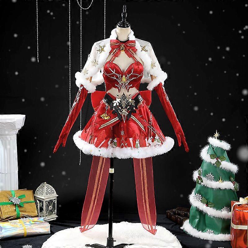 Step into the battlefield of winter wonder with this Sheila Snowbell Song Christmas Edition cosplay set, inspired by the popular Chinese action game Naraka: Bladepoint. Designed with holiday flair and heroic elegance, this red-and-white outfit combines festive joy with battlefield grace. From the snowflake cloak to the golden reindeer trim and ornate waistpiece, this costume brings Sheilas legendary limited-time skin to life for cosplay fans, photographers, and event performers alike. Key Features: Inspired by Sheilas official winter skin from Naraka: Bladepoint Layered red skirt with faux fur trim and festive prints Includes snowflake cape, long gloves, chest emblem, and belt bow Great for conventions, holiday-themed content, or professional shoots High-detail construction perfect for collectors and creators Package Includes: Dress 1 White cloak 1 Waist belt 1 Long gloves (pair) Bow accessory 1 Decorative crest piece Actual items may vary slightly from product photos. Available Sizes: XS / S / M / L / XL / XXL