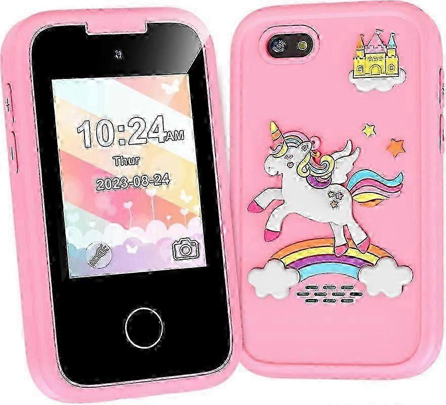 Upgraded Touchscreen Kids Cell PhoneKids smartphone with selfie camera, MP3 player, games, paint, voice recorder, country and daily guide, alarm, flashlight, stopwatch, calculator, theme, screensaver selection, time format, volume control, and more. It offers convenience, fun, and a new experience for kids ages 4-12. It is a perfect gift for 4,5,6,7,8,9 year old boys and girls. Educational Kids Toy&Funny GamesThe new kids' toy phone includes 26 alphabet lessons, 10 storybook fables, 24 country landmarks, and 5 daily activities. The phone also has 13 puzzle games for kids to enjoy and have fun while improving their logic, thinking, and reaction skills.This kid phone have been upgraded. It support selfie mode!With our kids smartphone drawing feature, kids can express themselves artistically no matter where they are, with no need for paper or a dedicated drawing area. Habit TrackingGirl's toy phones have a built-in flashlight for exploring and a timer for managing time. The habit recorder reminds children to engage in activities like studying, eating, and exercising, in order to develop good habits and improve self-discipline and focus. MP3 Music Player&Funny Photo FramesPhones for kids are equipped with high-quality speakers so that children can enjoy their favorite music without headphones. We also provide SD memory cards Built-in this kids smart watch, helps your child download MP3 children's songs, pictures and videos.Toddler phone has multi scenes to select, your children can take photos with 23 funny frames choose and leave much happy moments with family or friends.
