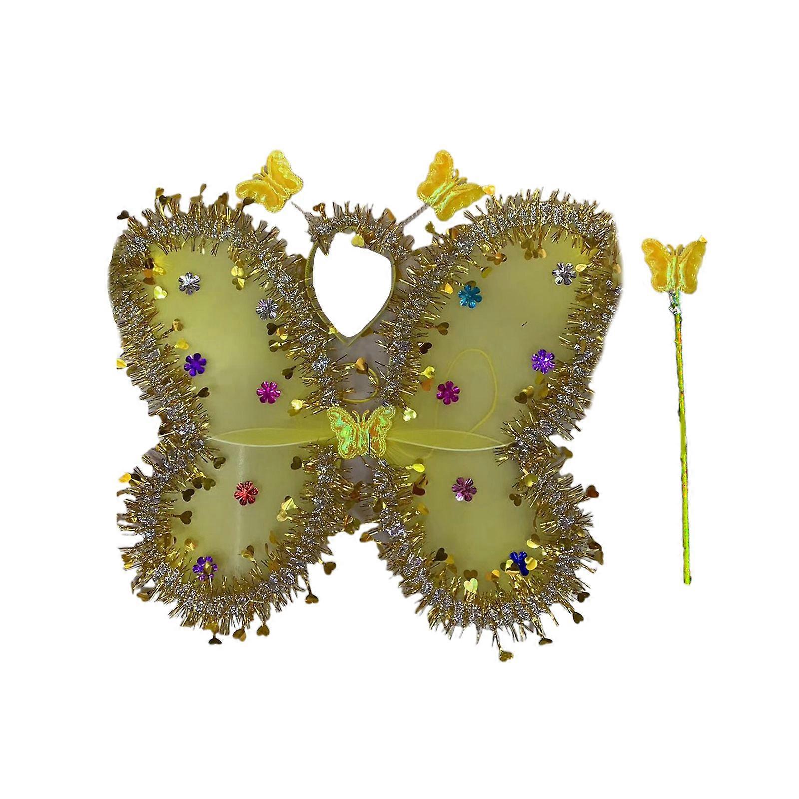 Girls RolePlay Butterflies Costumes Princess Fairy Wings Magic Wand Headband 3Pcs Halloween Cosplay-Party Props Yellow
