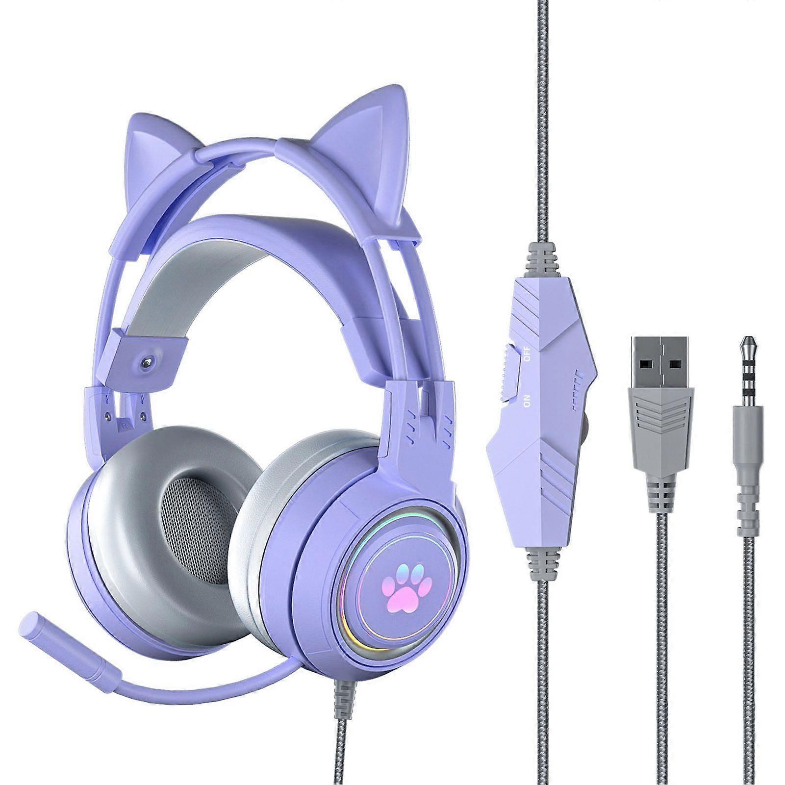 Cat Ear Headphones with Noise Reduction Mic for Girls All Wrapped Earcups Wired Over Ear Gaming Headset for PC Purple